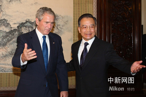 8月10日,中國國務院總理溫家寶在北京中南海會見美國總統布什一行。中新社記者 廖文靜攝