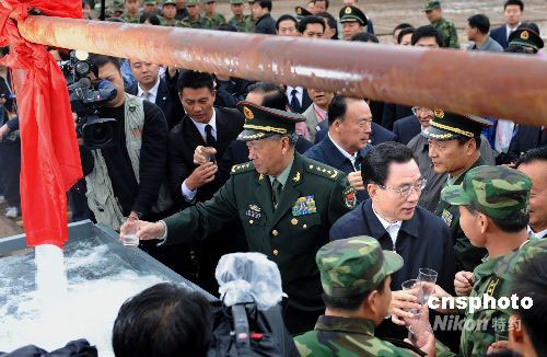 9月24日,寧夏回族自治區(qū)成立50周年慶祝活動(dòng)中央代表團(tuán)團(tuán)長(zhǎng)賀國(guó)強(qiáng)率一分團(tuán)到固原市慰問(wèn),在寧夏軍區(qū)給水團(tuán)正在打井的工地,賀國(guó)強(qiáng)拿起水杯同在場(chǎng)的民眾共同暢飲剛剛出井的“幸福水”。為幫助解決寧南山區(qū)和中部干旱帶用水困難,寧夏軍區(qū)組織給水團(tuán)實(shí)施新一輪“百井支農(nóng)富民”工程,初步解決近5萬(wàn)人用水問(wèn)題。中新社發(fā) 廖攀 攝