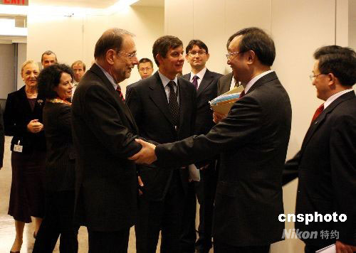 9月25日下午,中國外交部長楊潔篪在紐約與歐盟理事會秘書長兼歐盟共同對外關(guān)系與安全政策高級代表索拉納(左三)、歐盟委員會對外關(guān)系委員瓦爾德納(左一)、歐盟主席國法國外長庫什內(nèi)(中)、候任主席國捷克外長施瓦岑貝格(左二)等歐盟“三駕馬車”外長舉行會晤。中新社發(fā) 李靜 攝