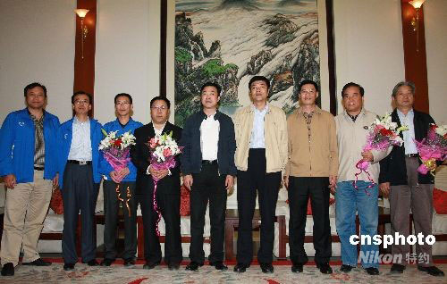 9月26日,在酒泉衛(wèi)星發(fā)射中心完成“神舟七號(hào)”發(fā)射任務(wù)后,北京航天科技集團(tuán)運(yùn)載火箭研究院第一批航天工作者返京,北京火箭專(zhuān)家機(jī)場(chǎng)在機(jī)場(chǎng)接待廳里與航天工作者合影留念。中新社發(fā) 鄭雄增 攝