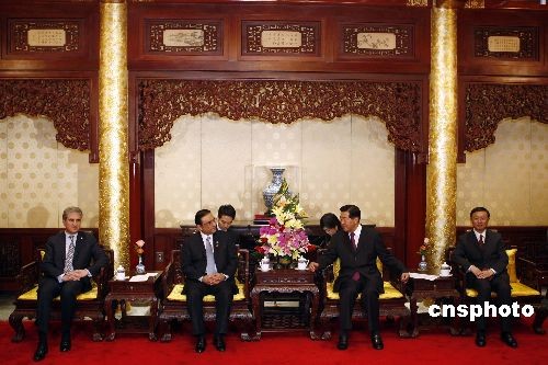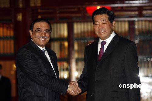 10月16日,中國全國政協(xié)主席賈慶林在北京釣魚臺(tái)國賓館會(huì)見巴基斯坦總統(tǒng)扎爾達(dá)里。中新社發(fā) 盛佳鵬 攝