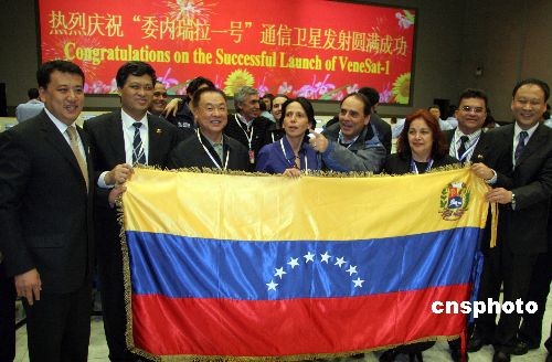 中委雙方在西昌衛星發射中心指控大廳共同慶祝衛星發射成功。 北京時間10月30日凌晨零時53分,中國在西昌衛星發射中心用“長征三號乙”運載火箭,將“委內瑞拉一號”通信衛星成功送入預定軌道。這是中國首次向拉丁美洲用戶提供整星出口和在軌交付服務。中新社發 孫自法 攝