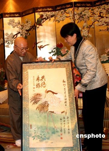 揚(yáng)州女市長王燕文和松浦俊海長老互贈禮品“共結(jié)來緣”。