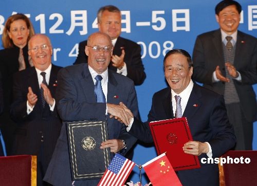12月4日,在第五次中美戰(zhàn)略經(jīng)濟(jì)對(duì)話期間,中美能源環(huán)境十年合作框架下綠色合作伙伴計(jì)劃的相關(guān)簽字儀式在北京釣魚臺(tái)國(guó)賓館舉行。中國(guó)國(guó)務(wù)院副總理王岐山與美國(guó)財(cái)政部長(zhǎng)保爾森分別代表中美兩國(guó)政府簽署了《中美能源環(huán)境十年合作框架下的綠色合作伙伴計(jì)劃框架》,并出席了相關(guān)合作意向書的簽字儀式。中新社發(fā) 盛佳鵬 攝