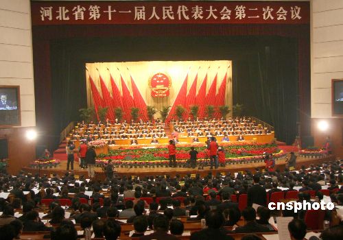 河北省第十一屆人民代表大會第二次會議1月8日在石家莊開幕,七百余名人大代表齊聚河北會堂,聽取和審議省政府工作報(bào)告。報(bào)告中提出該省今年經(jīng)濟(jì)增長9%的目標(biāo)。中新社發(fā) 田張夢 攝