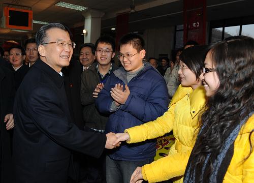 2月15日晚,正在天津調查研究的中共中央政治局常委、國務院總理溫家寶來到南開大學親切看望大學生。他勉勵同學們要心系國家,努力學習,甘于奉獻,樹立正確的擇業觀念。 新華社記者 李學仁 攝