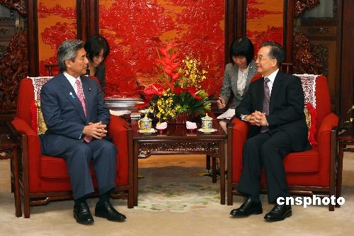 3月1日,中國國務院總理溫家寶在北京中南海紫光閣會見日本外相中曾根弘文。中新社發 盛佳鵬 攝