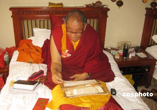 3月2日下午,赴北京出席全國“兩會”的政協委員、西藏林芝地區拉魯寺活佛洛桑·旦白尼瑪在所住賓館房間研讀會議材料。中新社發 張子揚 攝