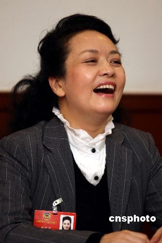 3月4日,全國政協十一屆二次會議進行分組討論,彭麗媛被青聯界其他委員的風趣發言逗樂。中新社發 傅丹丹 攝
