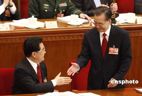 3月5日上午,十一屆全國人大二次會議在北京人民大會堂開幕,中國國家主席胡錦濤與國務院總理溫家寶互致問候。中新社發 盛佳鵬 攝