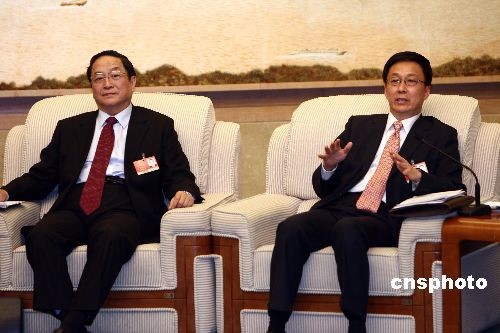 3月7日,全國人大上海代表團在人民大會堂舉行全體會議。上海市委書記俞正聲(左)、市長韓正出席會議。韓正在接受采訪時表示,已向國務院提交在上海成立人民幣結算試點申請,希望能盡快推進。中新社發 杜洋 攝