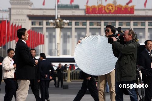 3月10日,外國媒體在北京人民大會堂前現(xiàn)場報(bào)道兩會。當(dāng)日,十一屆全國人大二次會議在人民大會堂舉行第三次全體大會,最高人民法院院長王勝俊、最高人民檢察院檢察長曹建明分別作工作報(bào)告。中新社發(fā) 杜洋 攝