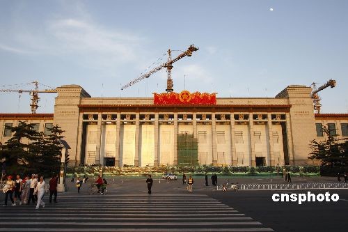 4月6日,中國國家博物館西門前罩上了綠色圍擋,工作人員正在加緊搭建上海世博會倒計時牌。據悉,該倒計時牌將于2009年5月1日上海世博會倒計時一周年之際正式亮相。全國政協常委、上海世博會執委會執行主任萬季飛在“兩會”期間表示,上海世博會將于明年5月1日開幕,在倒計時一周年之際,組委會將于今年5月1日在天安門廣場和國家博物館西門前豎立上海世博會倒計時牌,7月5日到15日將在首都博物館舉辦走進世博會大型巡展。中新社發 鄭雄增 攝