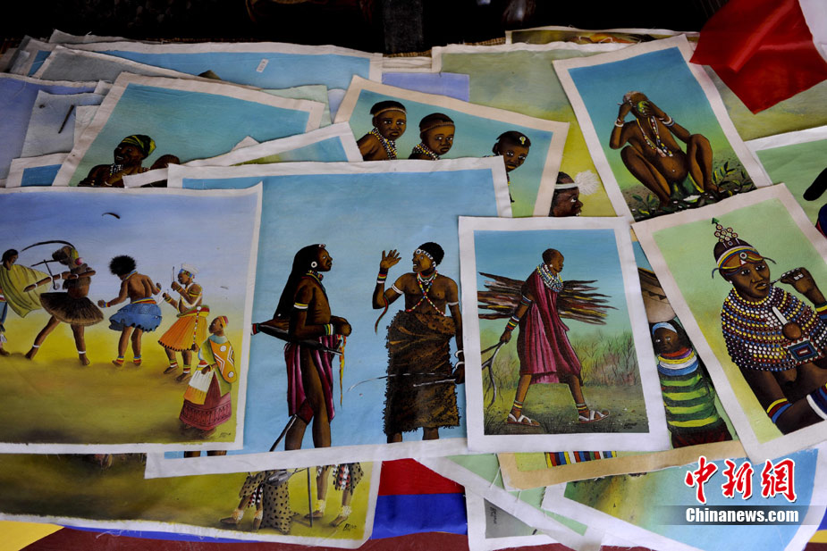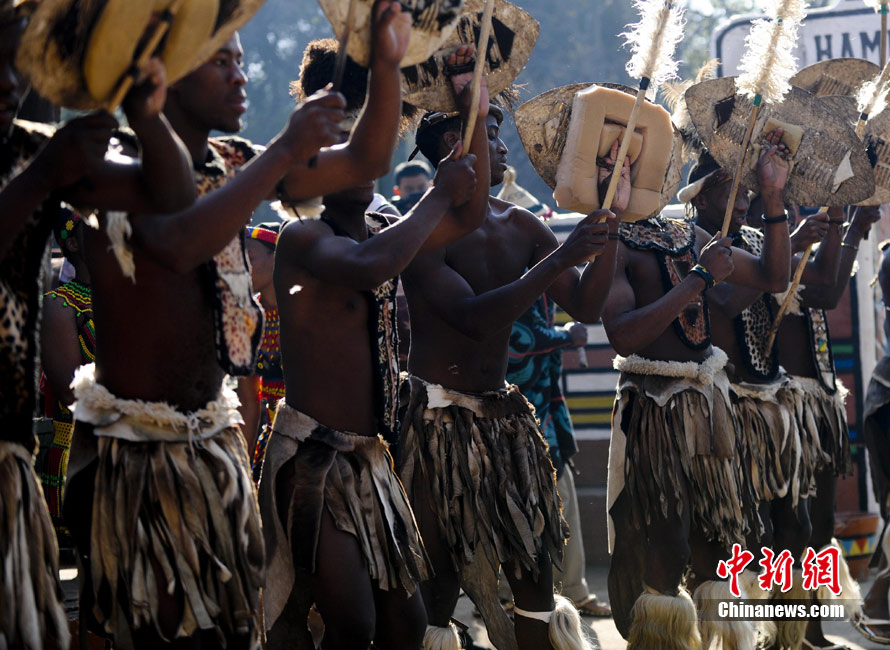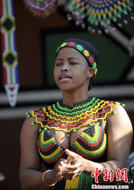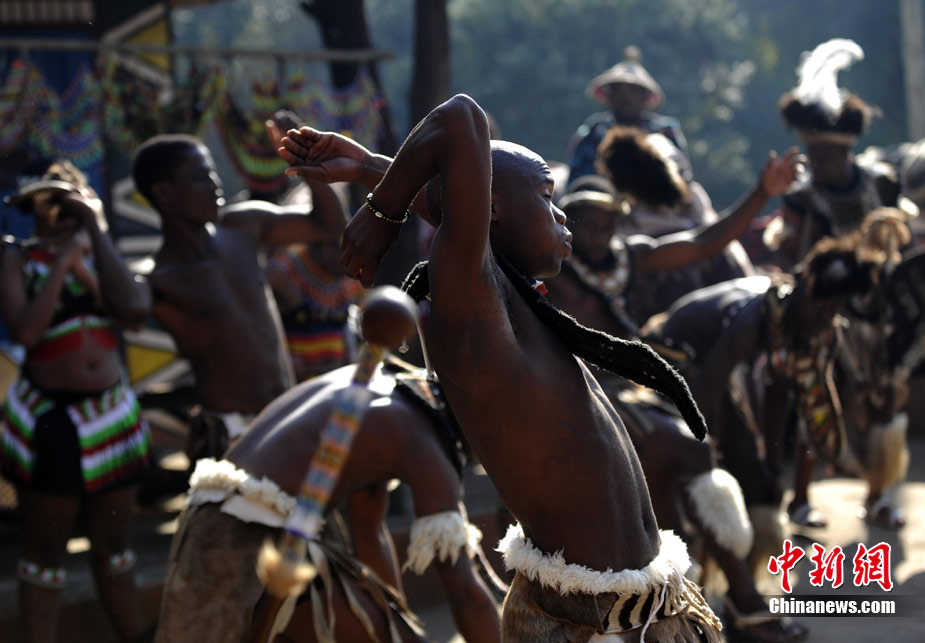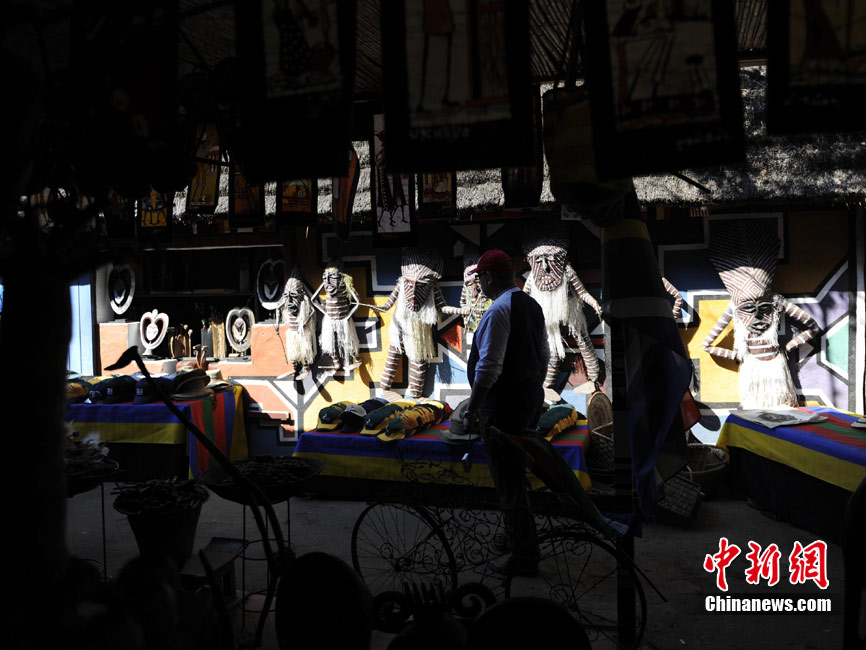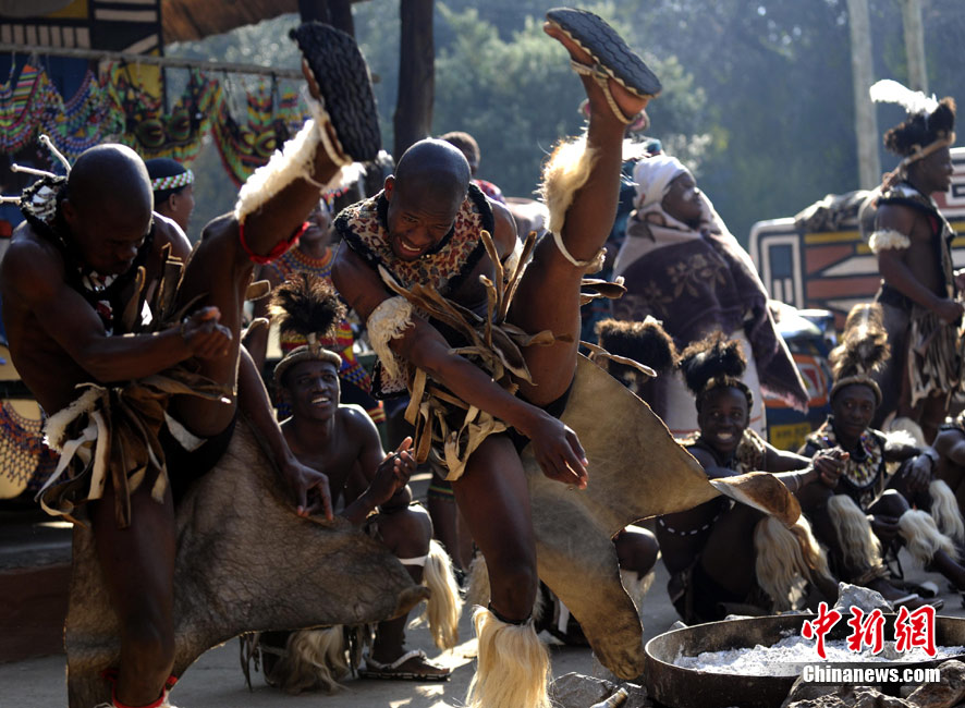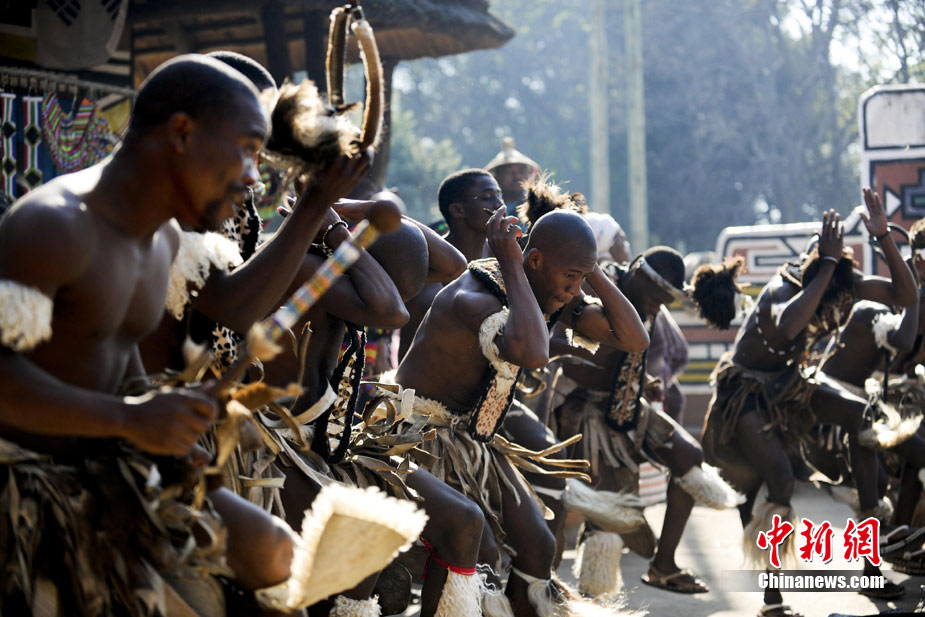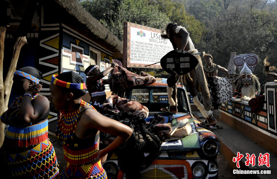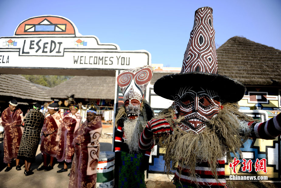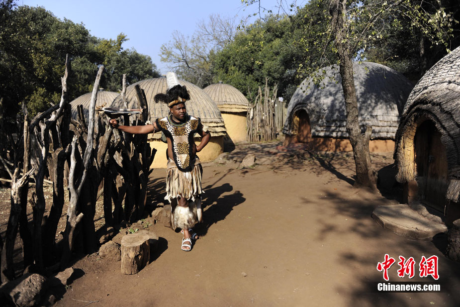 在南非約堡郊外,號稱“南非文化窗口”的萊賽迪(Lesedi)民俗村,聚居著南非最重要的四個部落。這里有著非洲土著餐飲,還有著原生態的舞蹈表演,當客人來訪,村民就會盛裝在村口迎接。圖為萊賽迪民俗村。 中新社記者 廖攀攝