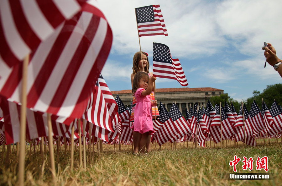 2010年6月30日,美國(guó)華盛頓,環(huán)保組織塞拉俱樂(lè)部的成員將數(shù)千面美國(guó)國(guó)旗插成“擺脫石油”(Freedom From Oil)的字樣,抗議墨西哥灣漏油事件。