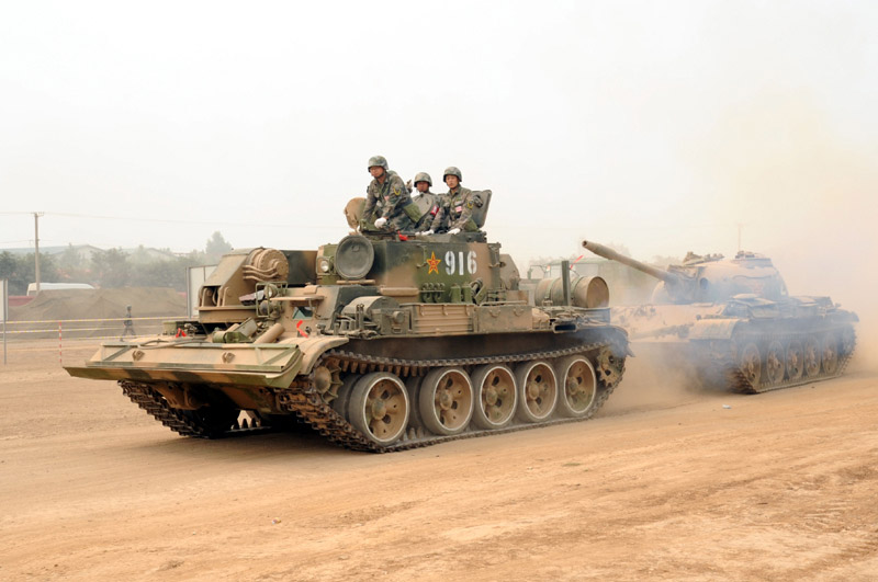 6月29日,北京軍區基礎比武進入第二天,裝甲搶救車牽引訓練坦克駛入比武現場。圖片來源:新華網 高航 攝
