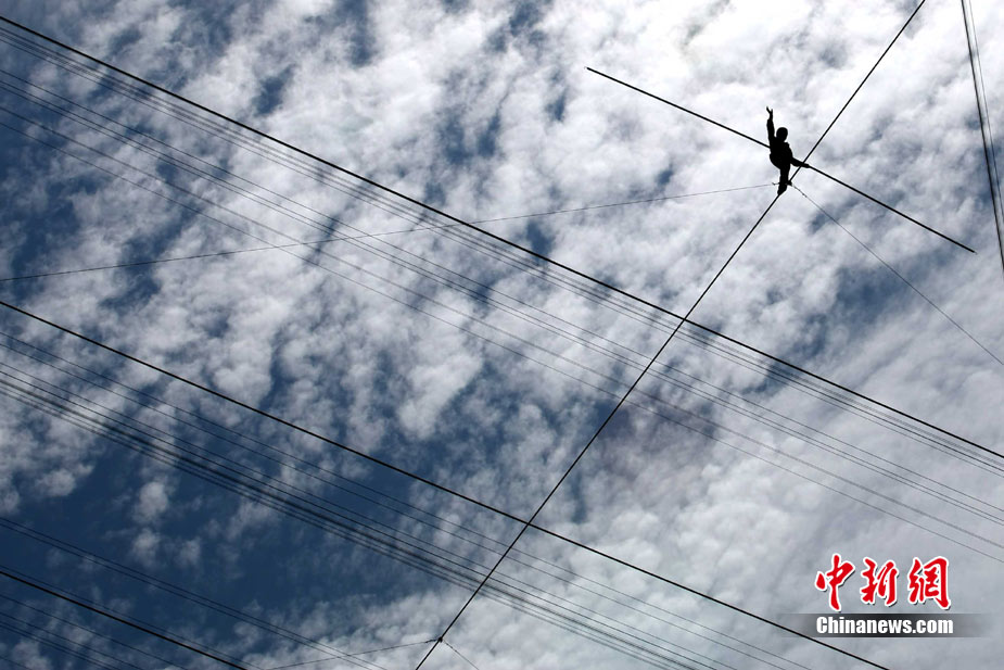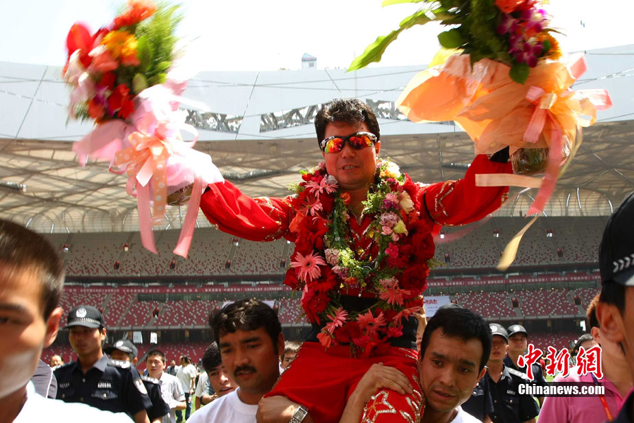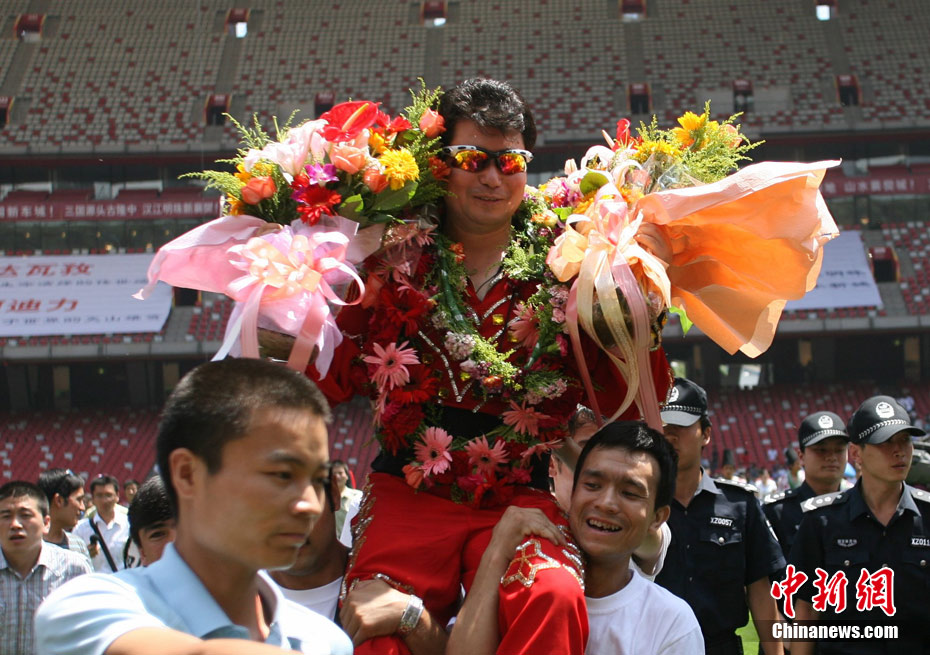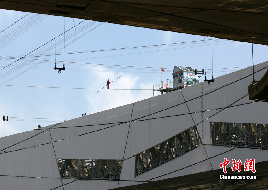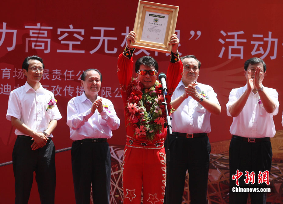 7月2日,在鳥巢上空艱難生活60天之后,高空王子阿迪力告別鳥巢回到地面,同時創造了60天累計連續走綱絲時間最長吉尼斯世界紀錄。圖為阿迪力用吊威亞的方式回到地面。中新社發 富田 攝