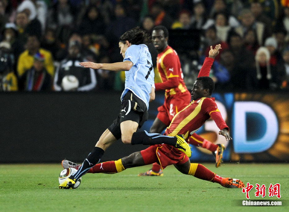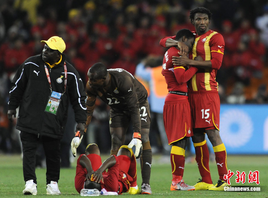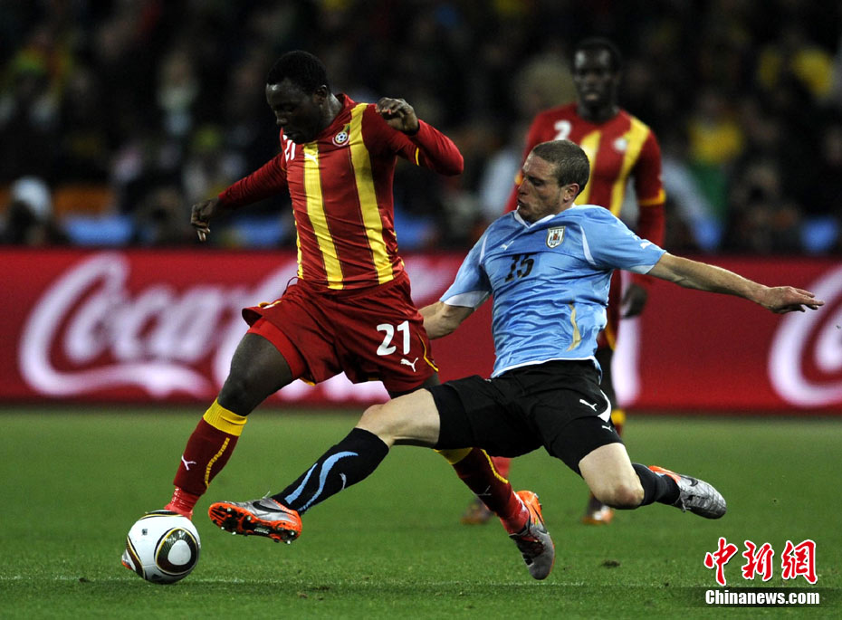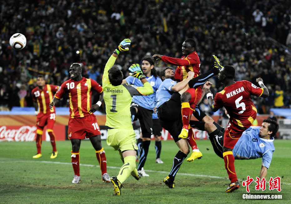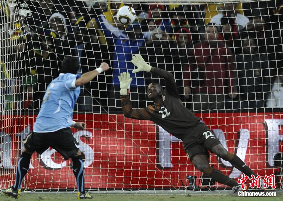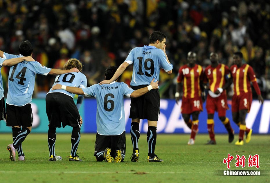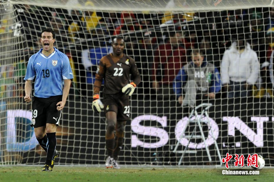 北京時(shí)間7月3日凌晨2:30,南非世界杯進(jìn)行了1/4決賽的第二場爭奪,由烏拉圭在約翰內(nèi)斯堡的足球城球場迎戰(zhàn)加納隊(duì)。120分鐘時(shí)間內(nèi),雙方憑借弗蘭和蒙塔里的進(jìn)球,1-1戰(zhàn)成平局。在點(diǎn)球大戰(zhàn)中,烏拉圭4-2擊敗對(duì)手,晉級(jí)半決賽。 中新社記者 廖攀 攝