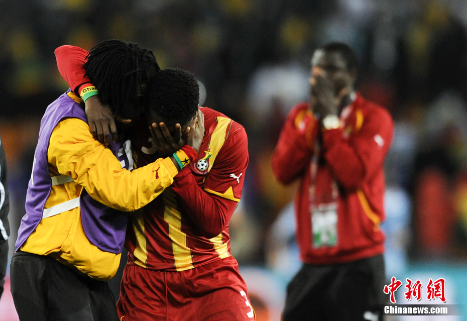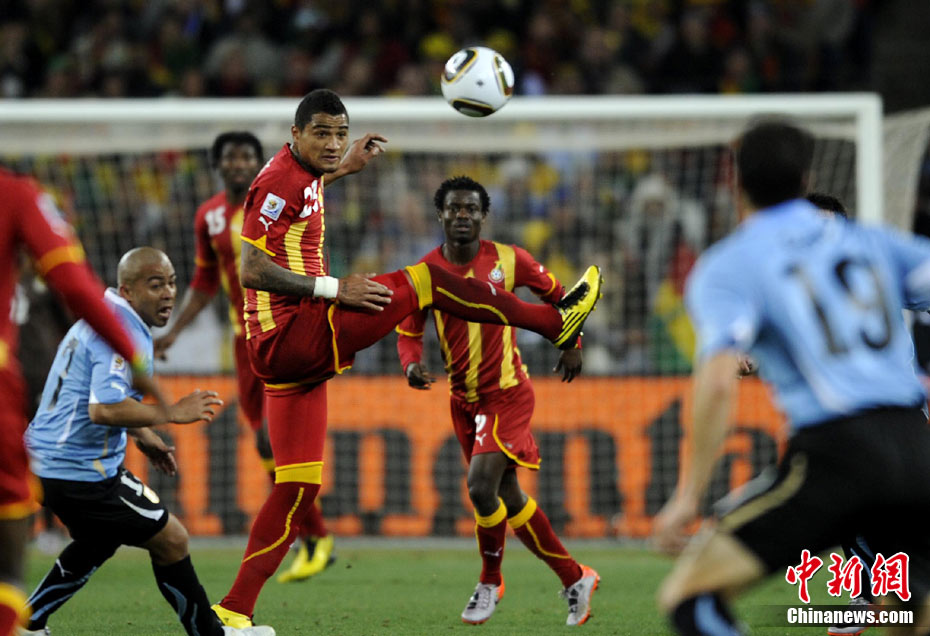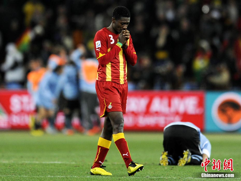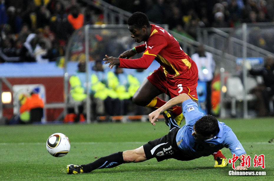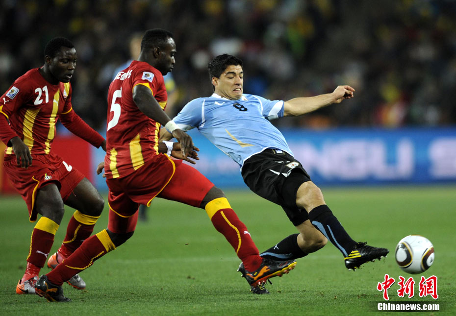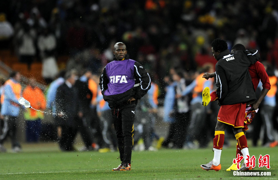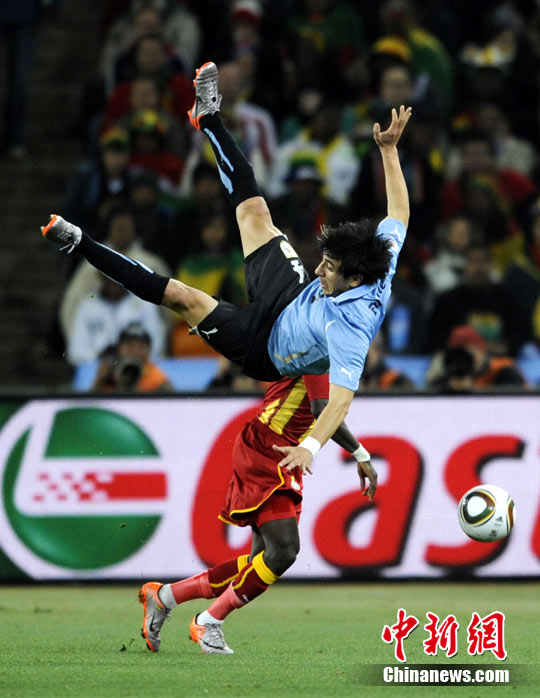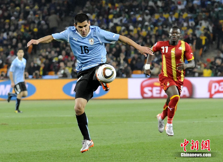 北京時(shí)間7月3日凌晨2:30,南非世界杯進(jìn)行了1/4決賽的第二場爭奪,由烏拉圭在約翰內(nèi)斯堡的足球城球場迎戰(zhàn)加納隊(duì)。120分鐘時(shí)間內(nèi),雙方憑借弗蘭和蒙塔里的進(jìn)球,1-1戰(zhàn)成平局。在點(diǎn)球大戰(zhàn)中,烏拉圭4-2擊敗對(duì)手,晉級(jí)半決賽。 中新社記者 廖攀 攝