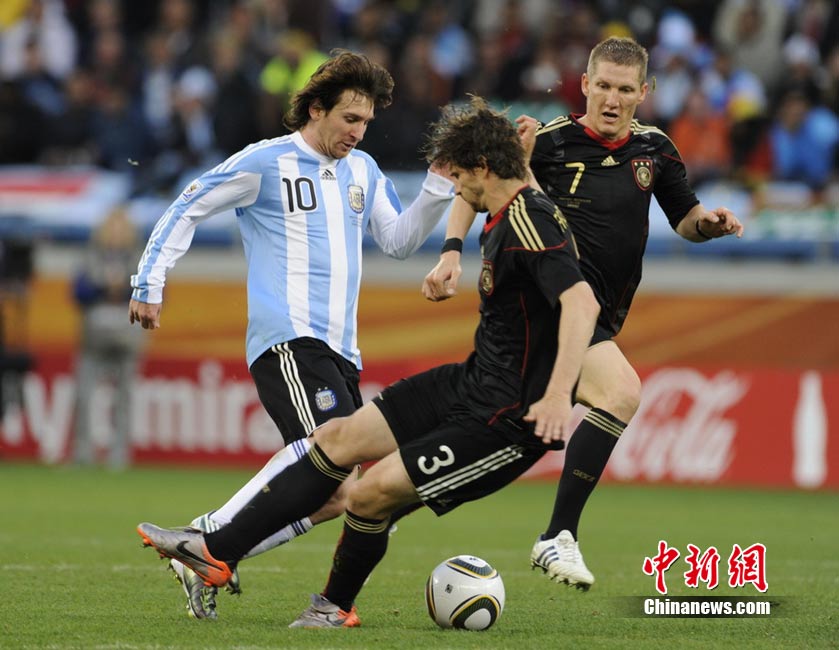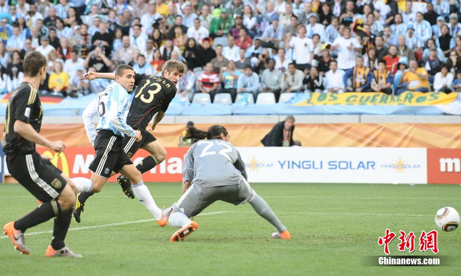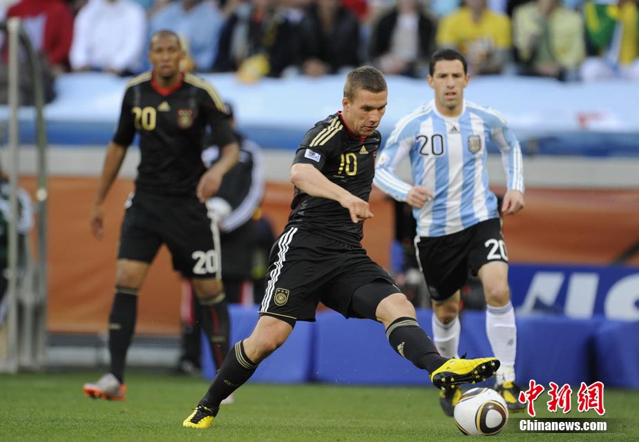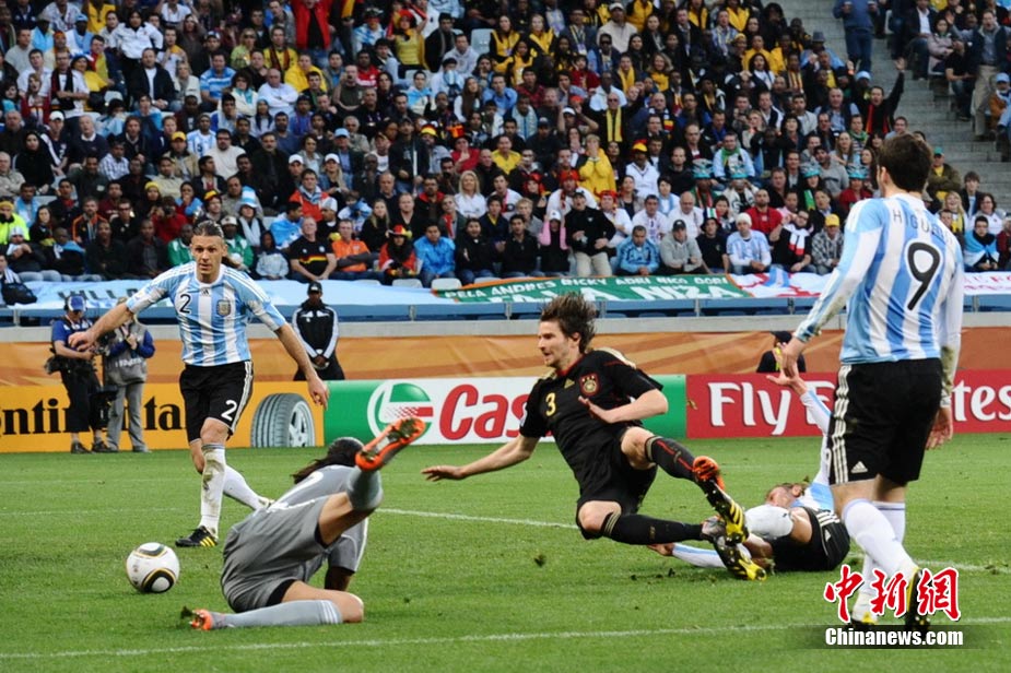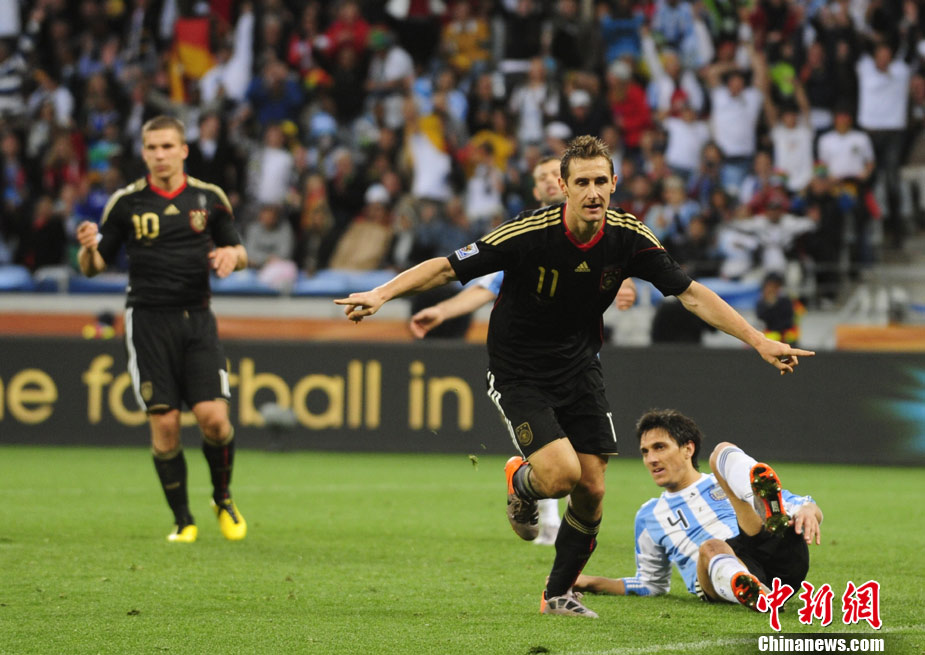 7月3日晚,南非世界杯1/4決賽第三場展開了角逐,阿根廷隊在開普敦綠點球場迎來了德國隊的挑戰。穆勒在上半場第3分鐘先拔頭籌,下半場克洛澤梅開二度,弗雷德里希也打入一球,德國隊4-0狂勝阿根廷,昂首晉級半決賽。