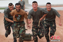 7月4日,參加“友誼—2010”中國巴基斯坦反恐聯合訓練的兩軍士兵進行體能訓練。此次訓練在中國寧夏青銅峽地區展開,主要以邊境地區山地聯合反恐作戰為課題,分為展示交流、混編同訓、綜合演練三個階段。這是兩國之間舉行的第三次反恐聯合訓練。中新社發 杜洋 攝