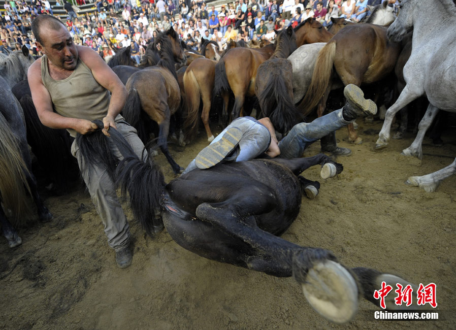 當地時間7月3日,西班牙薩武塞多,年輕人在傳統的“捕野馬節”上馴服野馬。作為古老的加利西亞節日,捕野馬節可以追溯到青銅時代的馴獸練習。