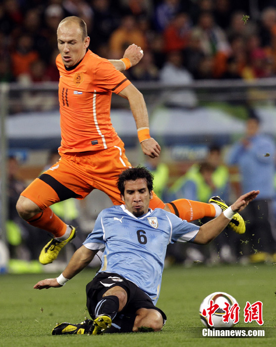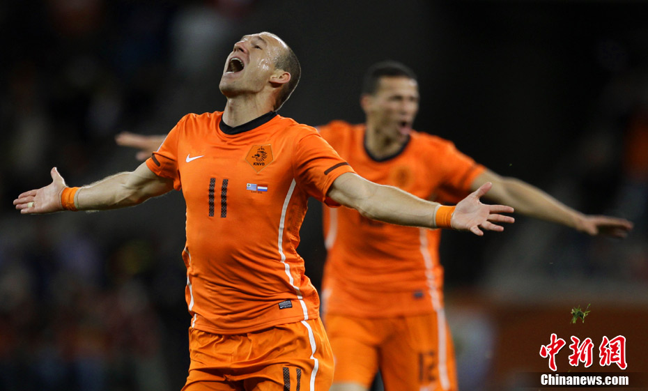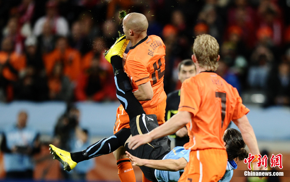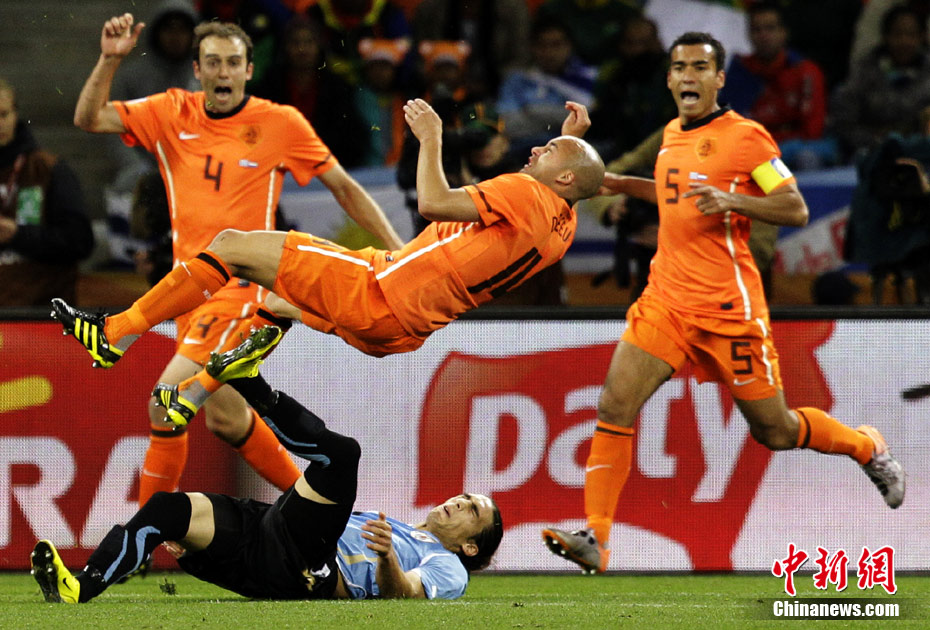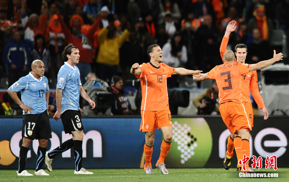 7月7日凌晨2:30,南非世界杯半決賽首場較量在開普敦綠點球場拉開戰幕,由南美老牌勁旅烏拉圭迎戰荷蘭隊。布隆克霍斯特遠射先拔頭籌,而弗蘭也通過一記遠射將比分扳平。下半場斯內德和羅本連續進球一度令荷蘭隊鎖定勝局,然而補時階段烏拉圭人的進球似乎又燃起了最后的希望,但荷蘭隊頂住了對手的瘋狂進攻,3-2擊敗烏拉圭隊,成功挺進決賽。