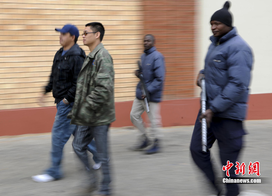 南非華人安保公司總經理謝宇航與南非當地員工持槍在約翰內斯堡中國商貿城內巡邏。約翰內斯堡被稱為全世界最危險的城市之一。世界杯期間,南非的這種保安公司不僅受雇為球隊做保鏢,而且在警力不足的情況下,許多保安公司受雇于警方,成為保衛世界杯安全的一支重要力量。而南非華人安保公司也是其中之一,他們的主要服務對象是位于約翰內斯堡核心城區的中國商貿城。中新社發 廖攀 攝