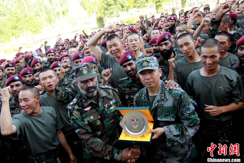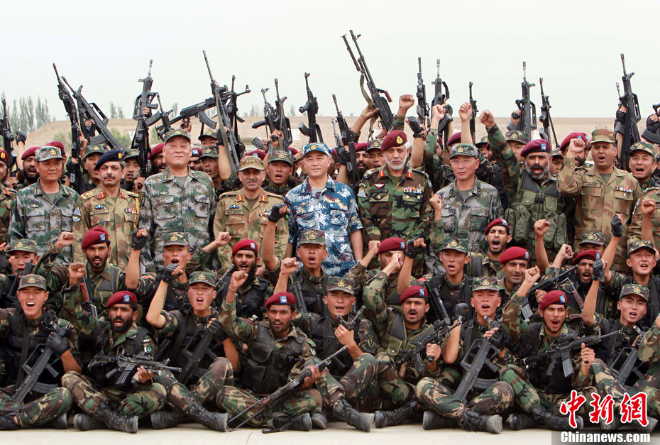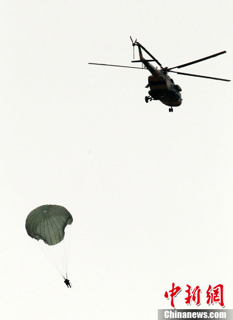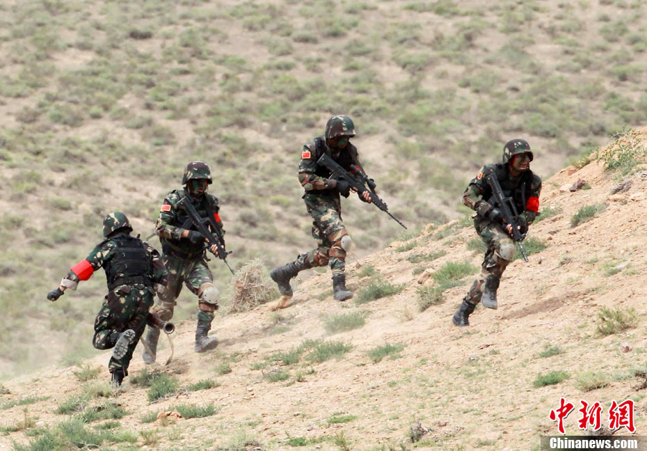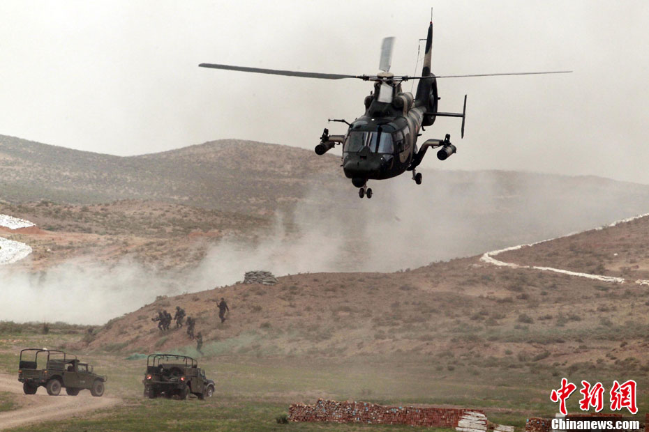 7月9日,友誼-2010”中巴反恐聯(lián)訓(xùn)在蘭州軍區(qū)某訓(xùn)練基地舉行實(shí)兵實(shí)彈演練,演練設(shè)計(jì)的背景是,對(duì)潛入中巴邊境地區(qū)實(shí)施襲擊破壞的國(guó)際恐怖分子進(jìn)行聯(lián)合打擊。圍繞“邊境地區(qū)山地聯(lián)合反恐作戰(zhàn)”這一課題,演練了遠(yuǎn)程投送、偵察監(jiān)視、立體封控、精確打擊、解救人質(zhì)、搜剿圍殲6個(gè)行動(dòng)。這次反恐聯(lián)演的一個(gè)亮點(diǎn),就是首次空地協(xié)同,聯(lián)合打擊,由地面反恐特戰(zhàn)人員引導(dǎo)殲轟機(jī)、武裝直升機(jī)實(shí)施空中火力突擊,采取精打要害的戰(zhàn)法,以建制內(nèi)的火器對(duì)恐怖分子營(yíng)地重要目標(biāo)實(shí)施火力打擊。中新社發(fā) 杜洋 攝