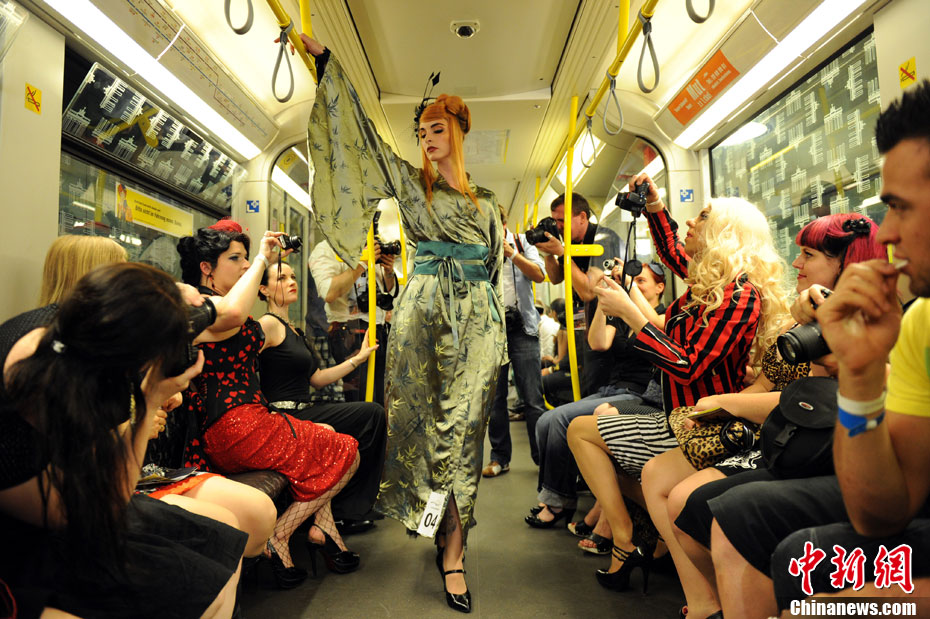 近日,模特穿行在德國柏林行駛的地鐵上進行時裝表演。這場名為“地鐵上的貓步”的時裝表演充滿朋克和搖滾元素,已經成為每年柏林春夏時裝周的一部分。