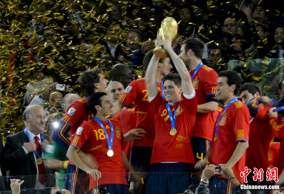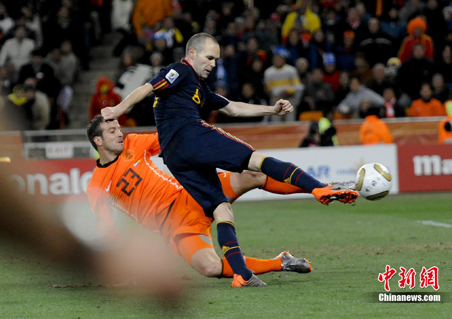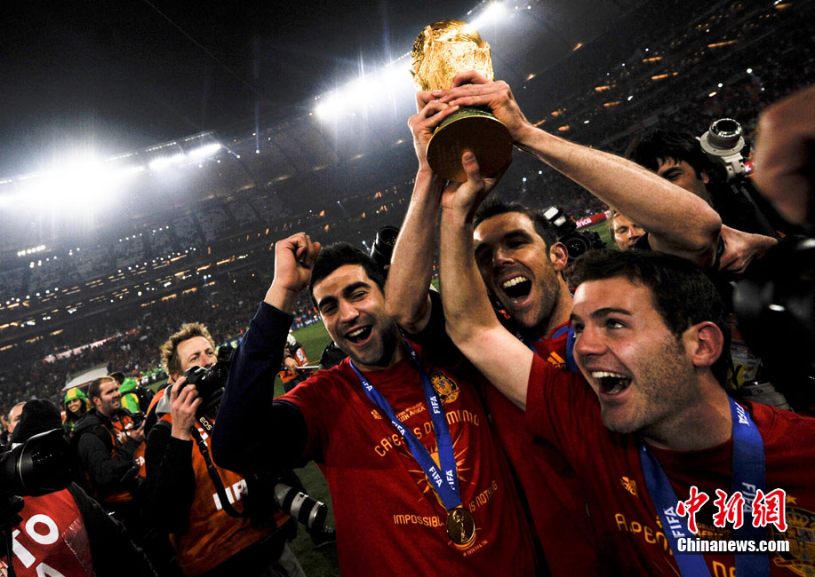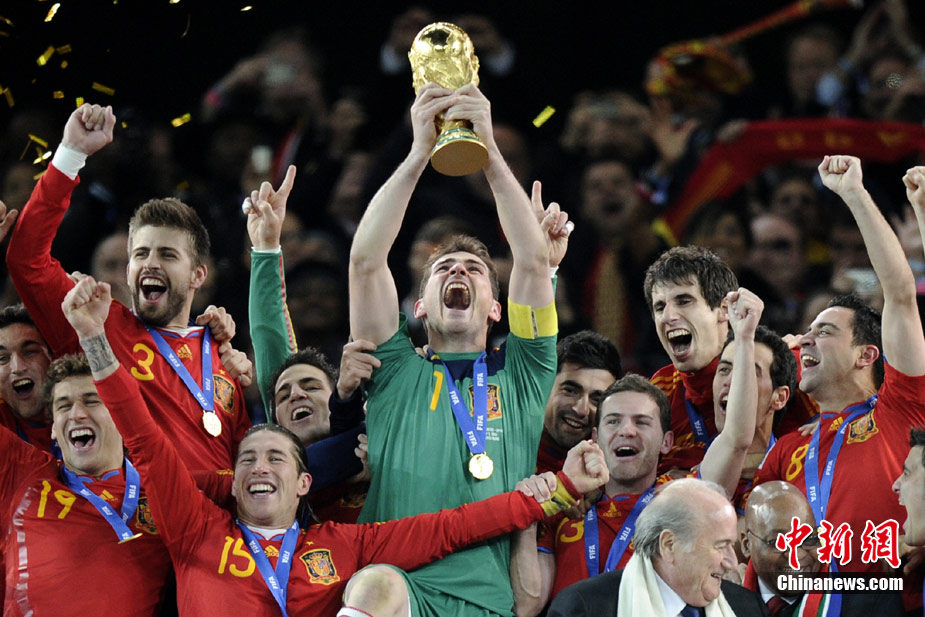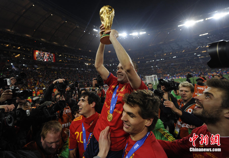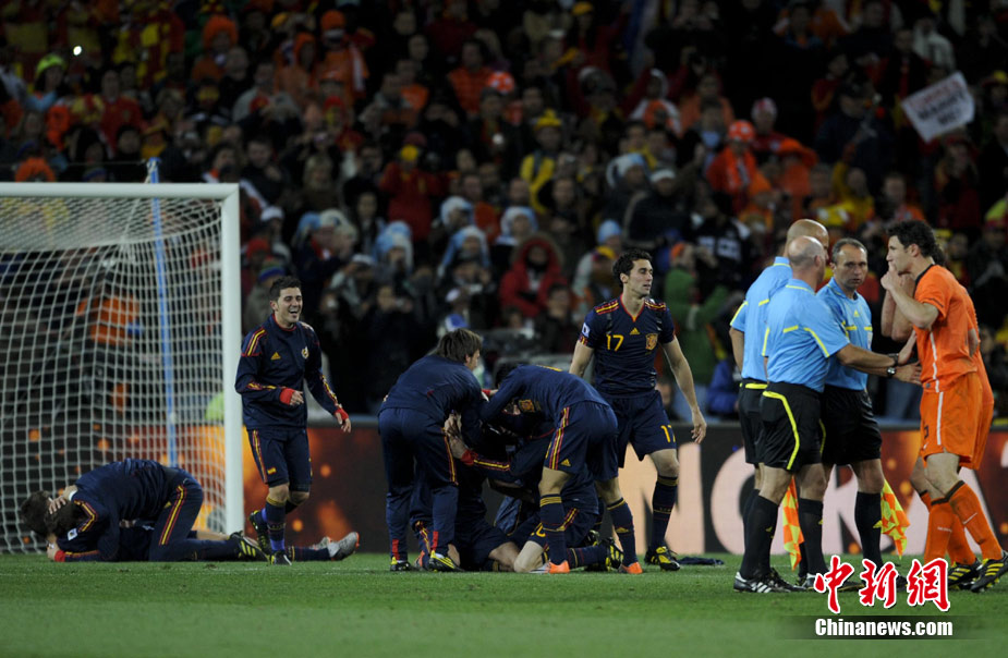 北京時間7月12日凌晨2:30,南非世界杯迎來了最終的決賽,在約翰內斯堡的足球城球場由荷蘭隊對陣西班牙。最終雙方經過120分鐘鏖戰,伊涅斯塔在第116分鐘攻入全場唯一一粒進球,絕殺十人應戰的荷蘭隊,史上首次奪得冠軍。