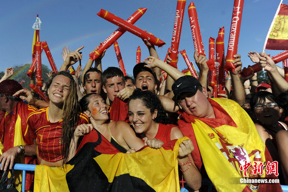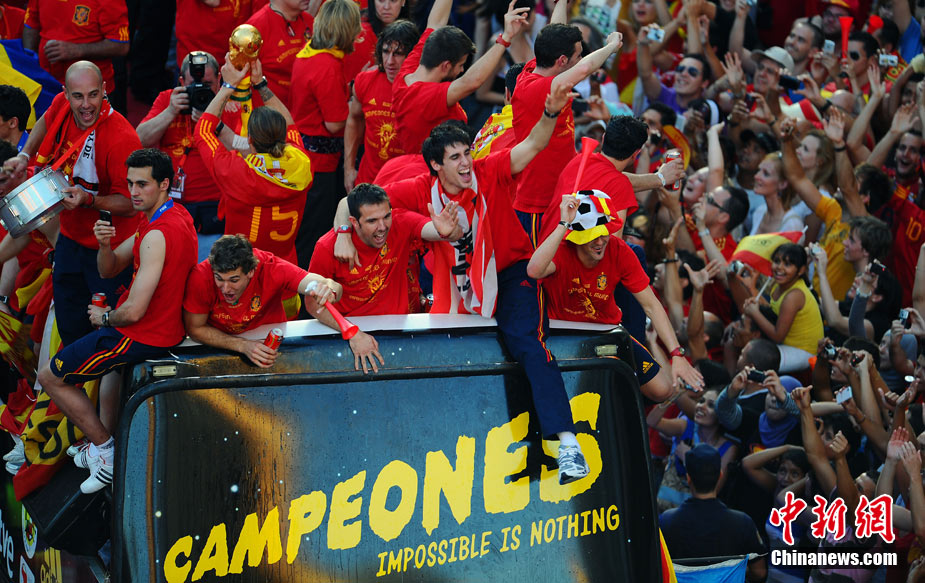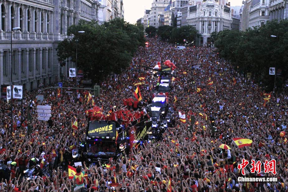 西班牙隊凱旋歸國 數(shù)萬球迷游街迎英雄
