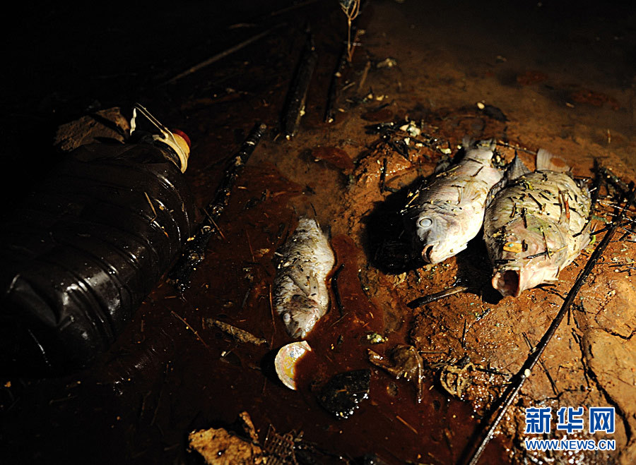 7月12日,位于汀江河下游的棉花灘庫區邊散落著因水質污染致死的河魚。