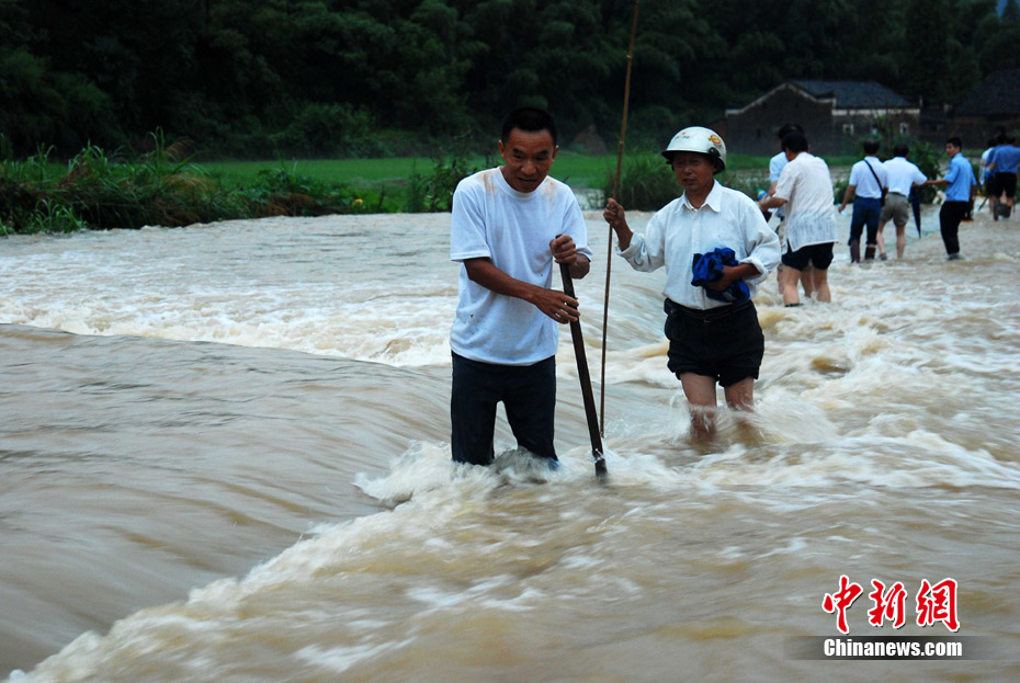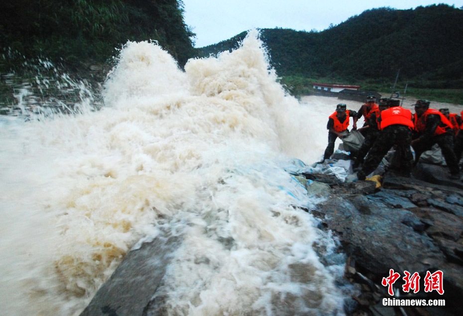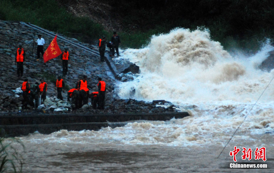 中新網都昌7月14日電(胡國林)14日,受強降雨襲擊,江西九江市都昌大港鎮梅溪水庫水位超過泄洪道1米左右,啟閉設備出現失靈,洪水如猛獸般狂瀉入下,部分村莊和數千畝農田被淹。 險情發生后,當地防汛部門立即組織抗洪搶險突擊隊,武警官兵和當地群眾冒著生命危險,拋石加固堤壩,防止洪庫潰堤,下游數千名村民已被安全轉移。