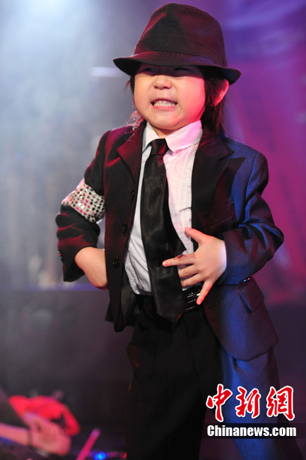 7月18日晚,陳楚生北京歌友會勁爆上演。4歲的街舞神童“小寶”王一鳴現場為陳楚生助陣。“小寶”年紀雖小,卻是位舞蹈天才,曾得到MJ舞蹈老師的肯定。他模仿MJ的經典舞步熱翻全場,贏得現場粉絲陣陣尖叫,風頭大有蓋過陳楚生之意。“小寶”驚人的舞蹈技藝也讓陳楚生大呼佩服。圖為小寶模仿起MJ像模像樣,舞技超群。中新社記者 李學仕 攝