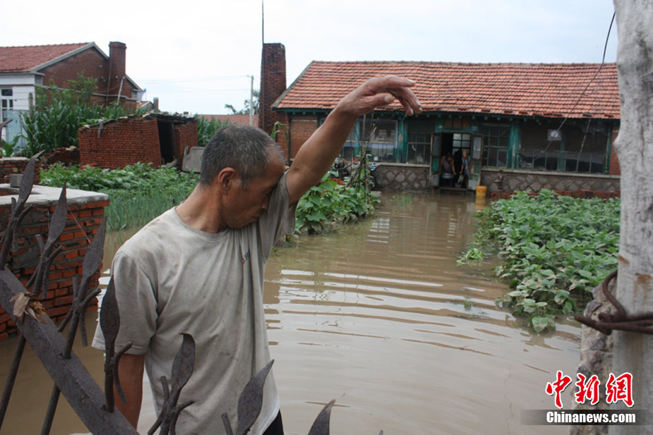 7月21日4時30分左右,遼寧省鐵嶺縣境內勝利河阿吉段決口,決口寬度20米,流量600立方米/秒,淹沒耕地5000畝,當地駐軍、公安干警、民兵預備役400多人投入抗洪搶險,轉移群眾3000多人。此前該地區連降暴雨,平均降雨362毫米。圖為阿吉村民金福祥看著自己家被淹沒非常傷心。中新社發 秦逸 攝