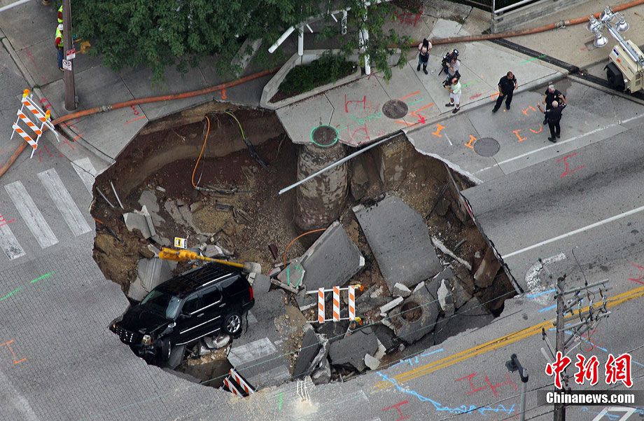 美國遭暴雨襲擊 汽車掉入“天坑”