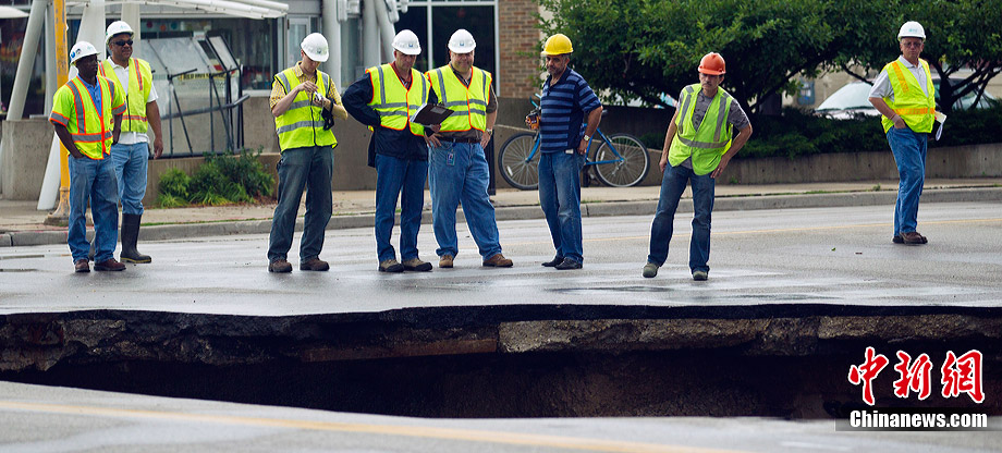 當地時間7月23日,美國南部威斯康星州遭遇強烈暴風雨襲擊,造成當地街道地面塌陷出現大洞,路過的汽車不慎掉入洞中。暴風雨還造成當地多處洪水泛濫。