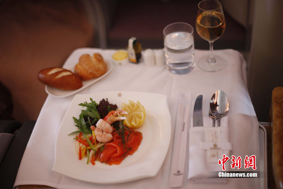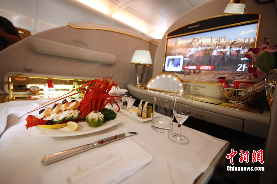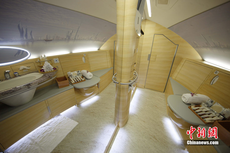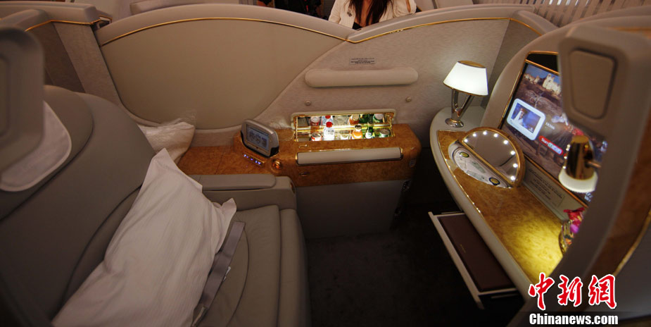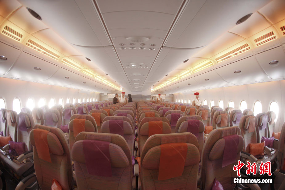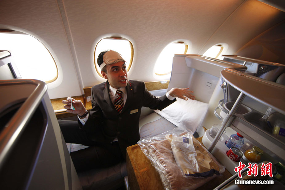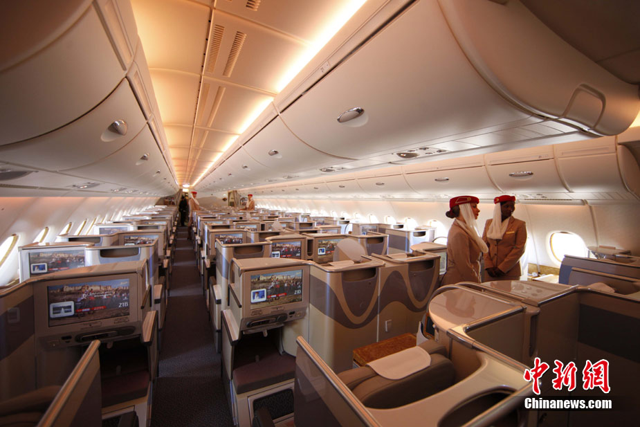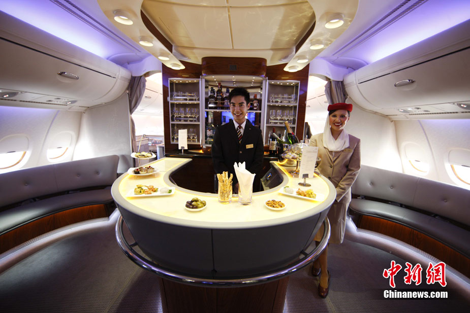 阿航A380 客機頭等艙內共有14個私人套間,設有兩間設備齊全的淋浴房,帶按摩功能的座椅可平躺成床。頭等艙和商務艙乘客還能享受如私人會所般、提供冷熱小點和酒品飲料的機上酒廊社交區。商務艙的座椅可放平成2米長的床,而經濟艙的座椅可以傾斜多達33英寸,讓乘客自由舒展身體。所有艙位的乘客都可以享用阿航多達1200個頻道的數碼寬屏機上娛樂系統,該系統提供空中娛樂節目。圖為阿聯酋航空空客A380上的空姐。中新社記者 盛佳鵬 攝