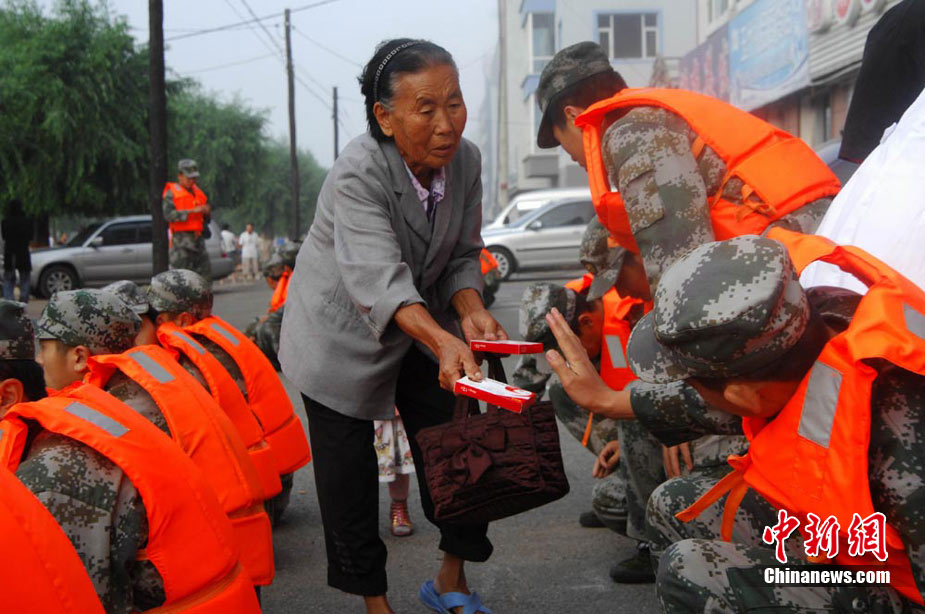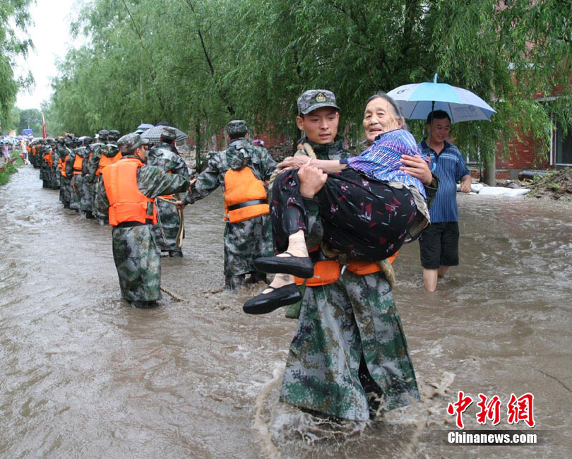 28日以來的一場暴雨讓吉林省多個地區遭遇罕見洪災,此后對災區的救援緊張進行。目前在永吉縣口前鎮,已有部分商戶恢復營業。圖為在重災區永吉縣,士兵將一名老婦轉移到安全地帶。中新社記者 張杰 攝