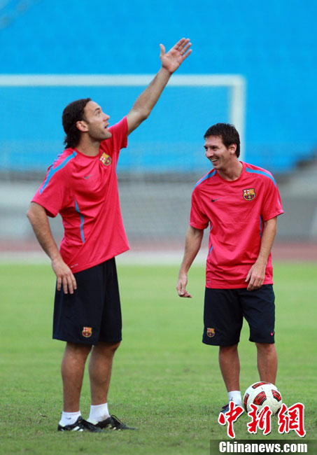 8月6日,巴塞羅那俱樂部在北京工人體育館進行了第二次公開訓練課,眾多巴薩球迷也在現場目睹了球隊風采。圖為梅西出場表情輕松。中新社發 杜洋 攝