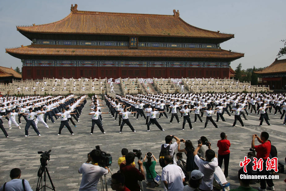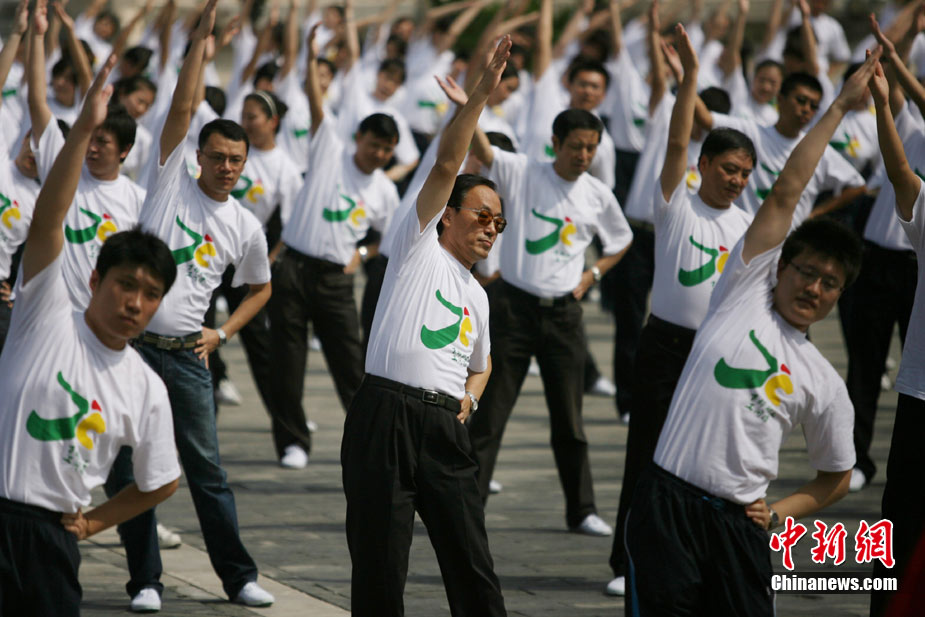8月10日,北京50余個基層單位和表演團體的近3000余名職工工間操小教員在北京市勞動人民文化宮太廟前與副市長、體育明星和勞模們一起做“第八套廣播體操”。當日,2010首都職工示范推廣工間操宣傳周啟動。中新社發 蘇丹 攝
