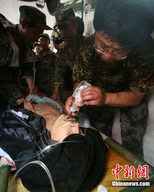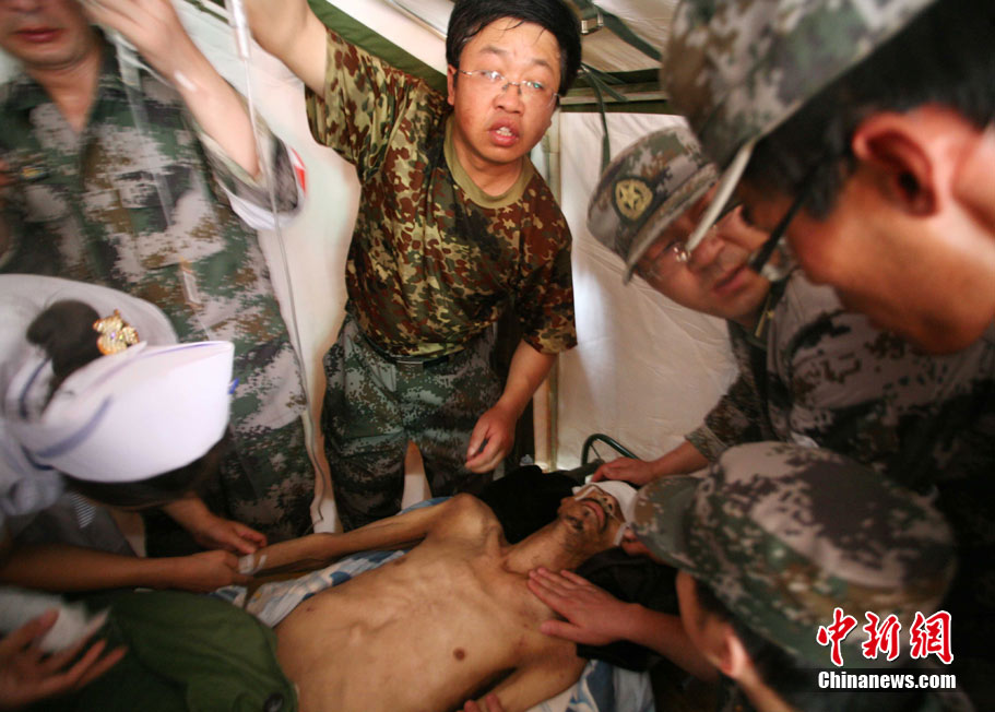 8月10日10時(shí)許,甘肅舟曲縣泥石流救援現(xiàn)場(chǎng)的移動(dòng)大樓附近發(fā)現(xiàn)一名幸存者,經(jīng)過四川廣元軍分區(qū)救援人員1小時(shí)30分的緊張營救,男子被成功救出。據(jù)悉,獲救者叫劉馬勝代,已被埋了近60個(gè)小時(shí),今年52歲,是一名殘疾人。目前,有關(guān)方面正在緊急調(diào)集直升機(jī)將其轉(zhuǎn)移至蘭州救治。中新社發(fā) 劉忠俊 攝