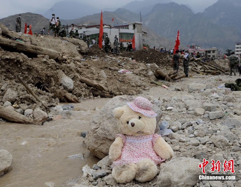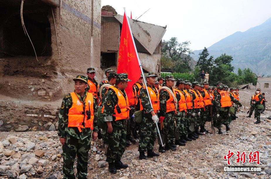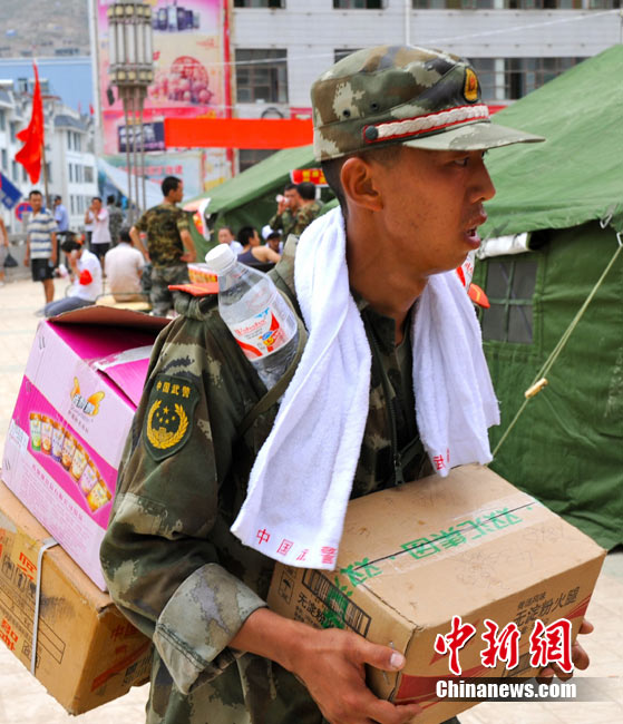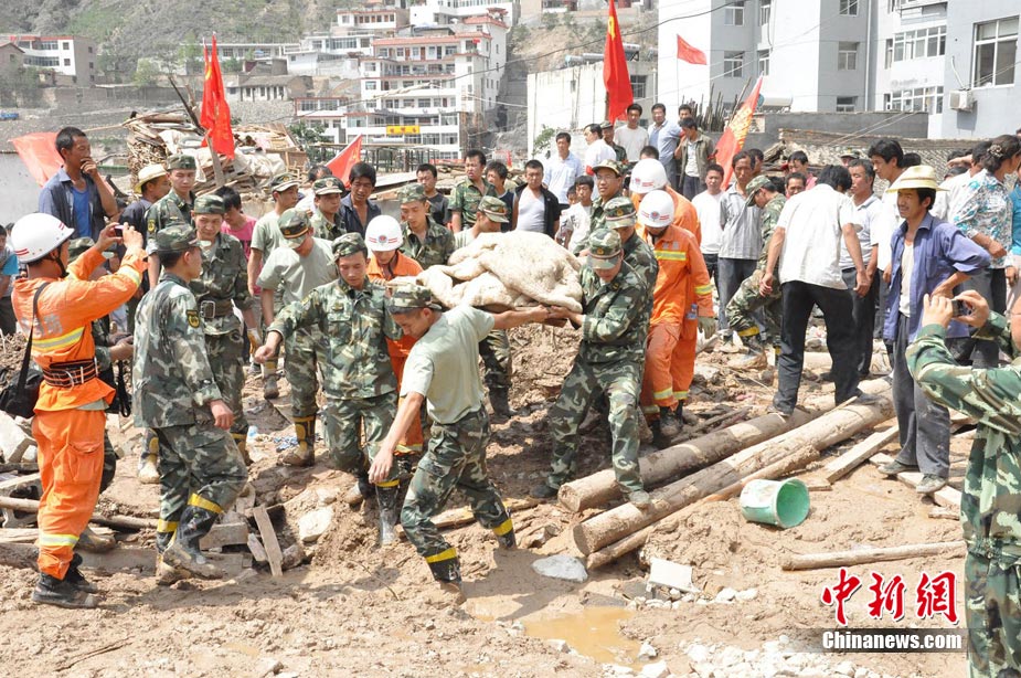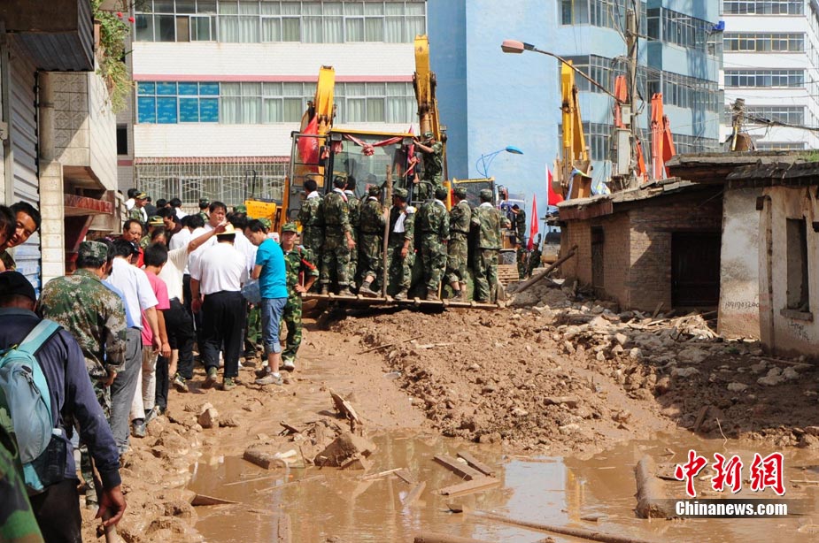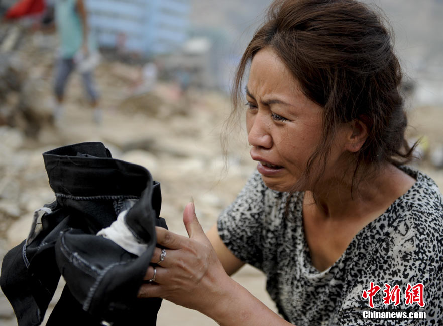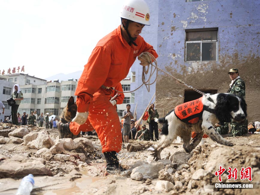 8月10日,甘肅舟曲泥石流災區(qū),來自西安的消防官兵攜搜救犬在災難現(xiàn)場全力搜救被埋人員。截至8月9日下午2時,特大山洪泥石流災害已造成337人死亡,1148人失蹤,成功解救受災群眾1242人。中新社發(fā) 廖攀 攝