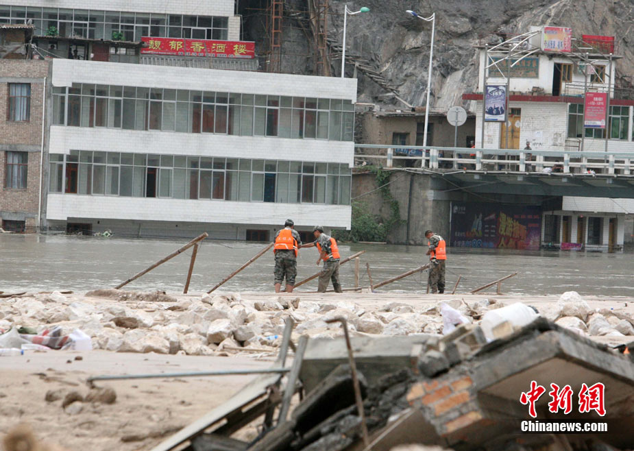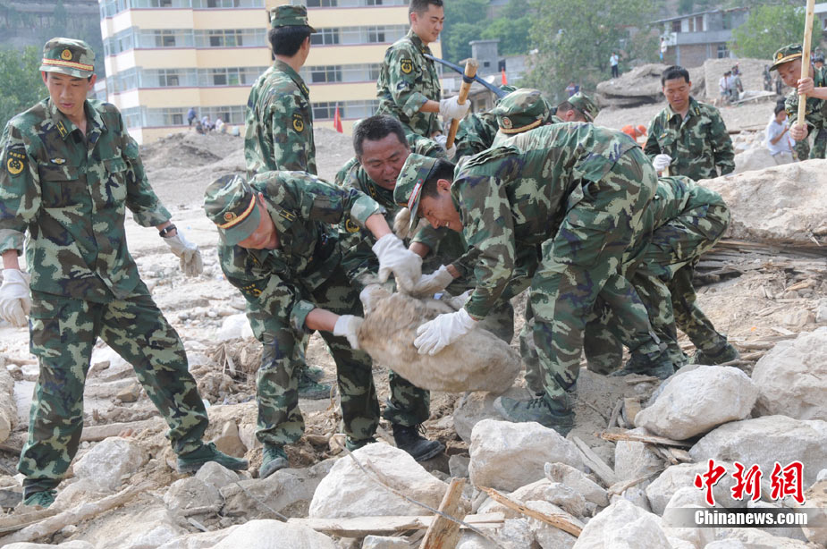 8月10日,蘭州軍區某集團軍“開山斧工兵團”兩次對舟曲災區堰塞湖實施爆破,雖然通過爆破,使河道基本疏通,但效果還不太明顯。11日,蘭州軍區工兵連將繼續爆破,使用炸藥重量也將提高。中新社發 劉忠俊 攝