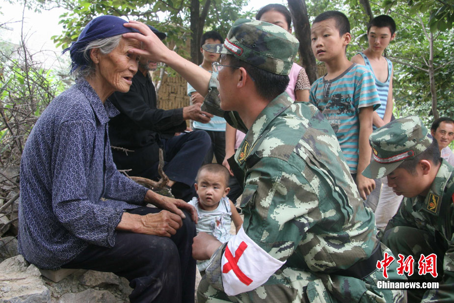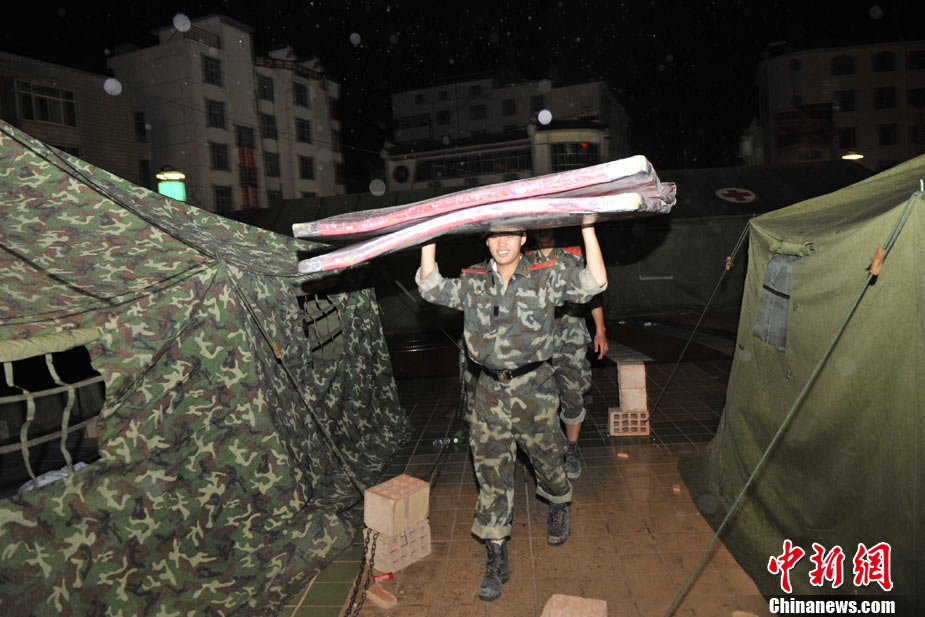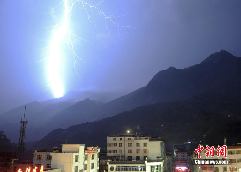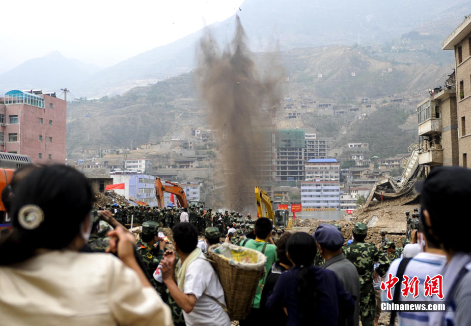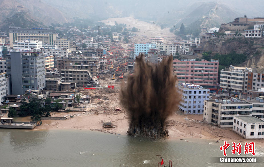 8月11日上午9時40分,蘭州軍區某集團軍“開山斧工兵團”對舟曲堰塞湖堰塞體成功實施第12次爆破。爆破后河道明顯出現斜坡,江水下泄速度明顯加快。圖為堰塞體12次爆破現場。中新社發 劉忠俊 攝