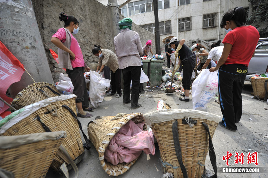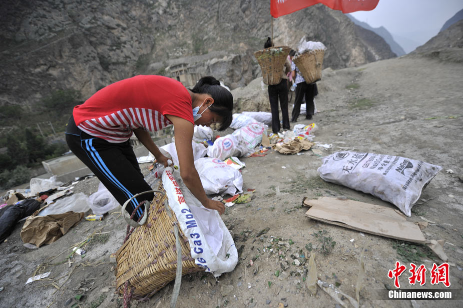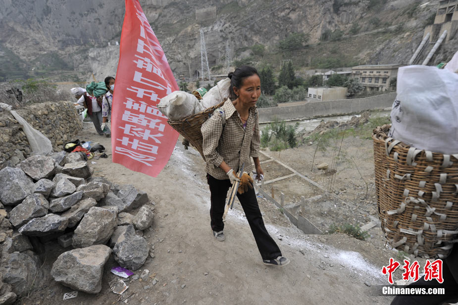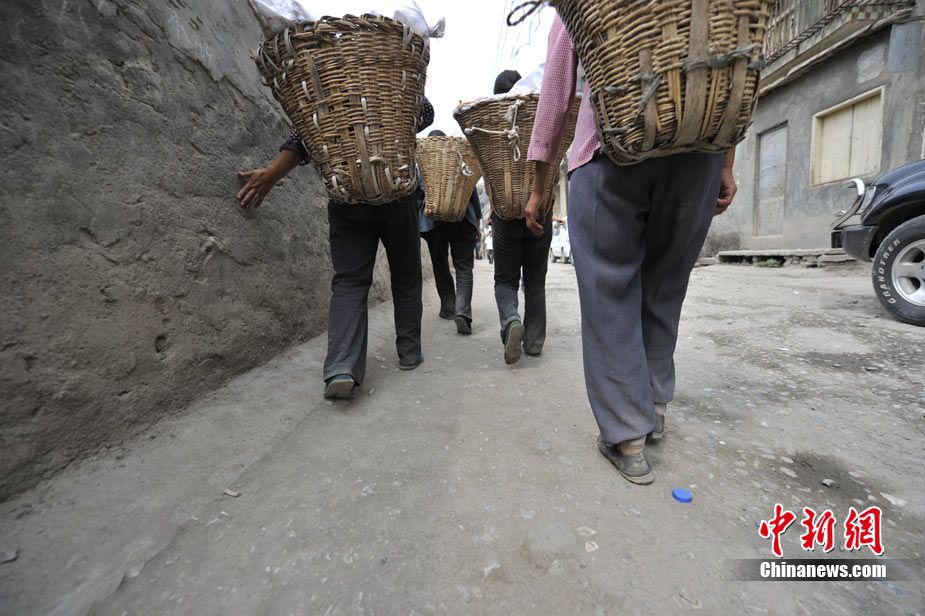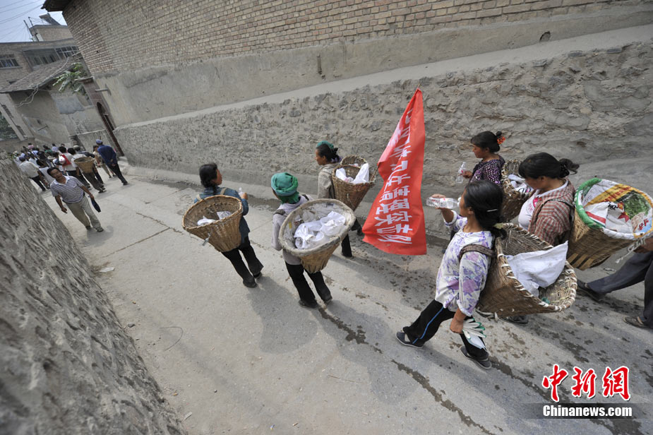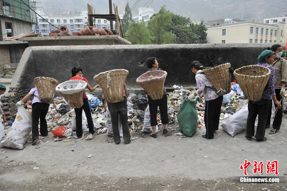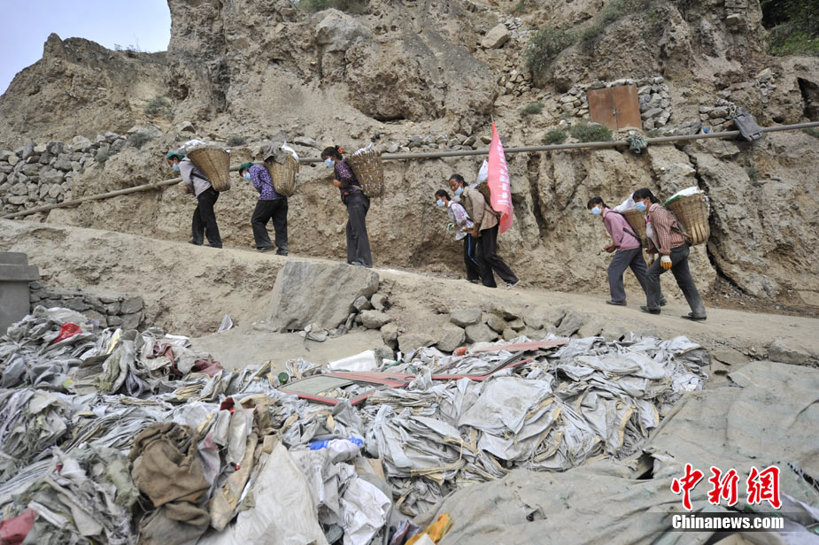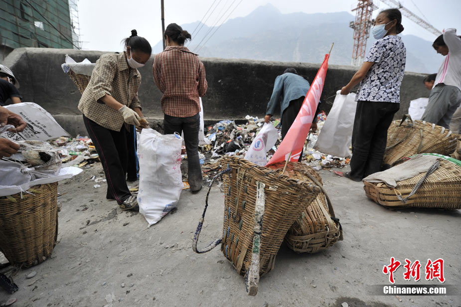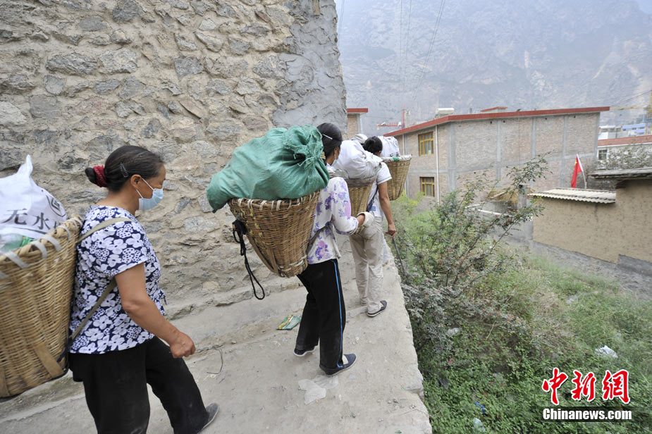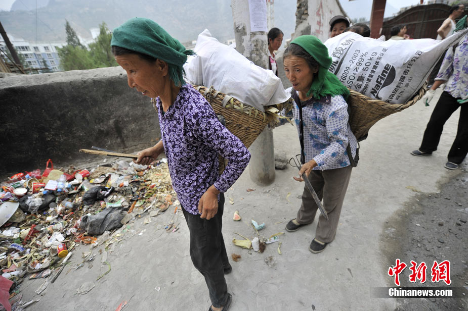 清晨8時許,舟曲鎖兒頭村的王旻桂和姐妹們來到城區(qū)。今天,她們的任務(wù)是將城區(qū)的生活垃圾清運(yùn)出去。這是一支“背簍突擊隊(duì)”——“城區(qū)環(huán)境衛(wèi)生清理突擊隊(duì)”的旗幟在王旻桂的背簍上飄揚(yáng)。“背簍”這種當(dāng)?shù)卮迕裼脕戆徇\(yùn)物品的日常工具,在救災(zāi)任務(wù)繁忙、交通不暢時,成為“利器”。