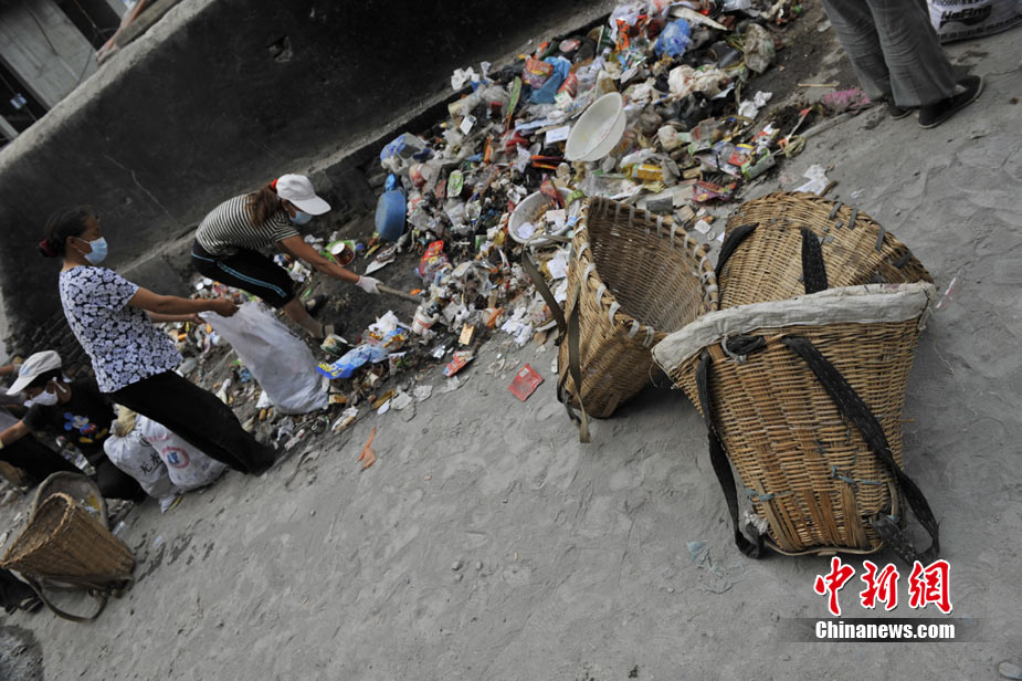 8點(diǎn)多,王旻桂和姐妹們裝起第一背簍垃圾,高高低低、曲曲折折、穿街走巷。城區(qū)中身著各種專業(yè)服裝、攜帶各種專業(yè)設(shè)備的救援隊(duì)來來往往。而這支“低調(diào)”的“突擊隊(duì)”還是引人側(cè)目。