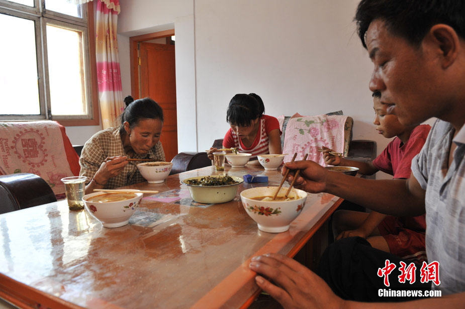到了午飯時間,“突擊隊(duì)”隊(duì)員們盛情邀請記者去家里吃飯。“我給你們做酸菜面!眲⒚废揉l(xiāng)音濃重,還需要經(jīng)過“翻譯”,記者才能聽懂她的話。劉梅先對“北京來的記者”頗為好奇,說她丈夫還專門想找記者給拍張照片。看她口渴四處找水喝,記者送給她一瓶,她卻舍不得喝,揣了起來。