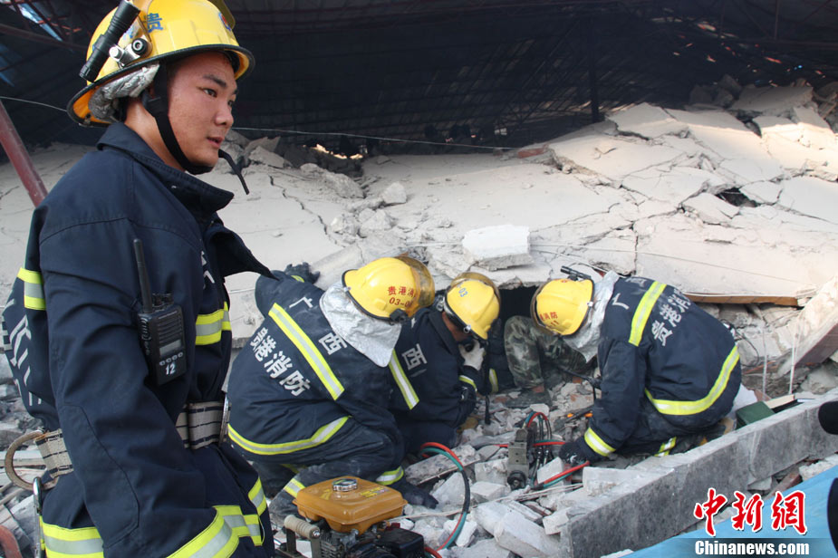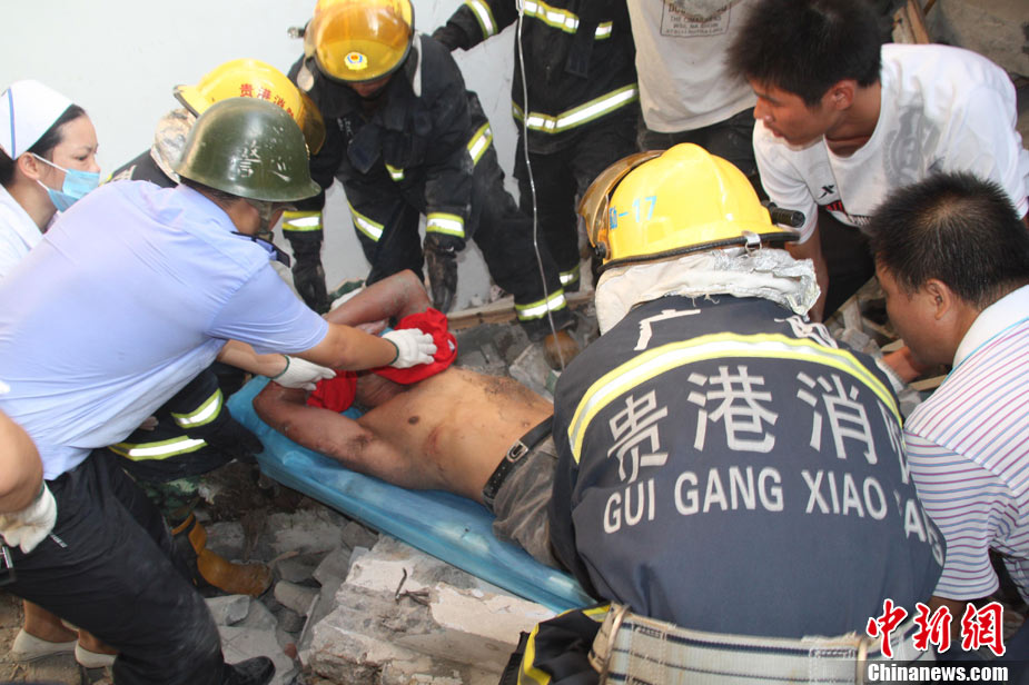 8月13日早晨,廣西貴港市橋圩鎮供銷社百貨門市部一棟3層的樓房突然倒塌,造成12名住戶被埋廢墟中。至上午10時50分,已知被埋人員被消防官兵全部救出,事故造成3人死亡9人受傷。中新社發 楊文福 攝